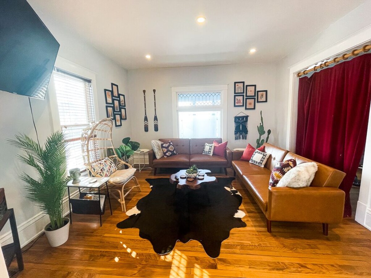 Welcome home to this spacious, boho, mod-chic 3BR duplex apartment in the Heart of Northeast with two levels of living space, artist inspired design and modern finishes throughout. This historic 1911 timepiece was fully restored and remodeled into a boho-modern packed with amazing amenities like coffee bar, two private porches, in-unit washer/dryer, 6-1 record player, professionally cleaned and sanitized to CDC and Airbnb Enhanced Standards.
