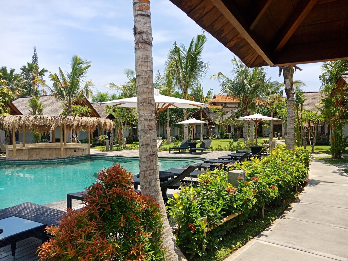 Das Konzept des Ortes ist ein Boutique-Resort. Es ist ein großes Grundstück mit ca. 1 Hektar für den Raum. In dieser Anlage befinden sich 15 Bungalows, 10 Deluxe-Zimmer, 3 Villen, 2 Pools, eine Poolbar, ein Restaurant, ein Loungebereich und ein großer Parkplatz für Autos und Motorräder. Der Ort hat viele Gärten und es ist sehr grün und beruhigend für die Augen. Es ist wirklich wie ein Dorf wegen der verschiedenen Arten von Immobilien, die es im Inneren hat. Einer der Pools ist recht groß und mit Natursteinen gebaut. Es ist mit Sonnenliegen umgeben, perfekt zum Sonnenbaden und hat eine tolle Poolbar. Das Restaurant und der Loungebereich / die Rezeption befinden sich im traditionellen javanischen Gebäude namens Joglo. Es ist wirklich authentisch und wunderschön. Die Deluxe-Zimmer sind modern, sauber und geräumig. Der Bungalow-Zimmertyp ist der auf den Bildern.