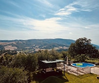 Diese charmante Villa in der Nähe von Pergola bietet einen ruhigen Rückzugsort auf dem Land für bis zu acht Gäste, umgeben von Weinbergen und Olivenhainen. Mit zwei Küchen, drei Schlafzimmern, drei Bädern und einem privaten Pool (geöffnet von Mai bis September) ist sie ideal für Familien oder Gruppen, die Platz und Komfort suchen. Der eingezäunte Garten, die Sonnenliegen und der Grillplatz laden zu Mahlzeiten im Freien und entspannten Nachmittagen ein. Kostenloses WLAN und die gemütliche Einrichtung sorgen für modernen Komfort. Nur 10 km entfernt bezaubert Pergola mit seinem Museo dei Bronzi Dorati und seinen mittelalterlichen Gassen. Erkunden Sie die nahegelegene Isola di Fano (6 km) für das Nötigste oder fahren Sie an die Adriaküste (36 km) für Strandvergnügen. Naturliebhaber können im Naturschutzgebiet Gola del Furlo wandern oder die Marmitte Dei Giganti in Fossombrone besuchen, um einen atemberaubenden Blick auf die Schlucht zu genießen. Geschichtsinteressierte werden das Castello di Frontone2 und das ruhige Kloster Fonte Avellana zu schätzen wissen. Genießen Sie rustikale Gerichte im Il Tagliere Di Biondi Michela E C. S.N.C., genießen Sie Pizza in der Il Tagliere Pizzeria oder entspannen Sie bei Wein und regionalen Gerichten im Il Vicoletto Pergola. Süße Leckereien erwarten Sie im Pane e Dolci F.lli Peruzzini, während das Meeting Pub gemütliche Snacks und Getränke anbietet. Für ein malerisches Essen ist das Agriturismo Locanda Magnoni ein beliebter Treffpunkt der Einheimischen.