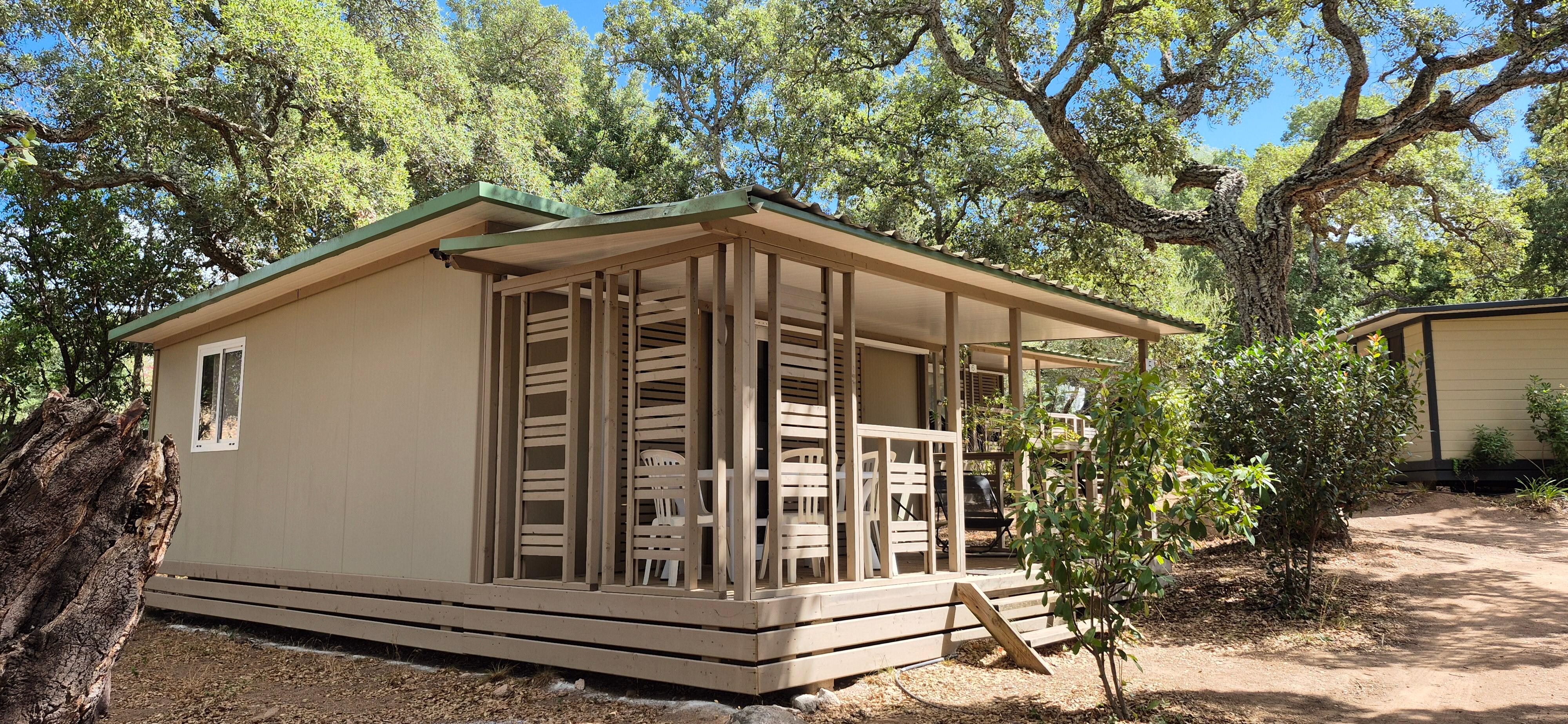 A must for families wishing to adopt an optimal accommodation resolutely trend for their holidays. The chalet has 2 bedrooms, one with a bed of 140x200 cm and the other 3 beds of 80x200 (including 2 bunk), a kitchen equipped with a refrigerator, a 4-burner gas hob, microwave and crockery. the kitchen is both useful and generous. A sliding patio door enhances the living space in / out for the comfort of the users.