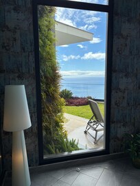 Step outside to your private paradise where you'll find a lovely outdoor pool offering panoramic ocean views. Start your mornings with a delightful breakfast on the outdoor furniture or savor a dinner al fresco under the stars. A barbecue is available for outdoor cooking enthusiasts, while sun loungers and a manual fitness bike are provided for both relaxation and exercise. Wander through our beautiful garden adorned with EstrelĂcia flowers, adding a unique charm to your stay.