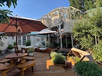 beyond the 'park and walk to everything' location... the High Street Cottage sits on a great piece of property. The kitchen is white tile and marble counters with an O'keefe Merit gas range, hand thrown stoneware dinner, kitchen and bake ware; set up with cooks in mind. Koi pond, Gardens (flowers, herbs, salad and vegetables (in season)), decks and patios to relax and enjoy your stay, a great laundry facility and a full outdoor kitchen. At the center of the property are our art studios and too many great amenities to list.