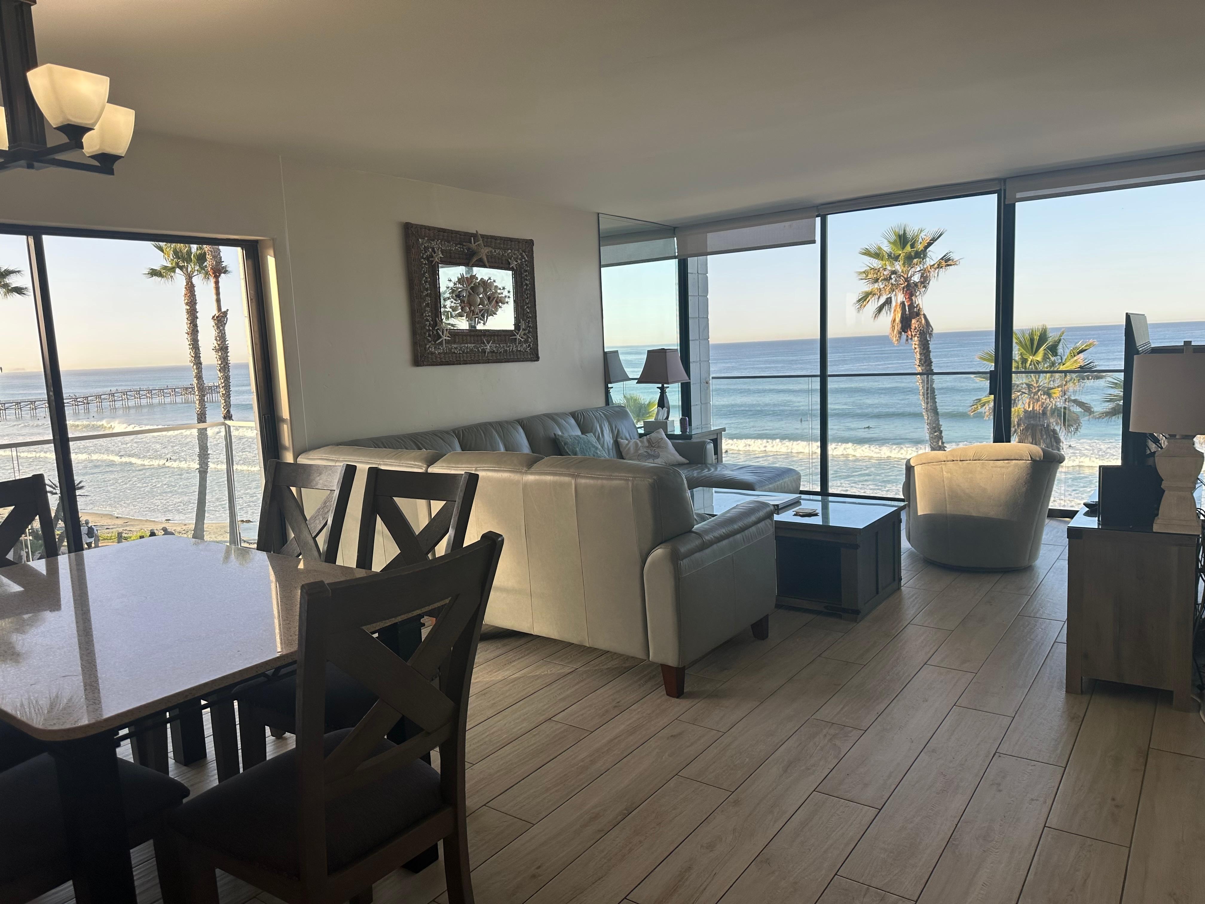 Gemütliche Ecksuite am Meer mit atemberaubendem Blick auf das Meer und die belebende Meeresbrise. Eingebettet im Herzen von Pacific Beach, 30 Sekunden vom berühmten Pacific Beach Boardwalk und nur wenige Gehminuten von der lebhaften Garnet Avenue entfernt, wo Sie eine Vielzahl an köstlichen Gerichten, Pubs und Clubs genießen können. Diese Wohnung in zentraler Lage in San Diego befindet sich am Strand in der Nähe der Innenstadt von San Diego, des Zoos von San Diego, der La Jolla Cove, der Seaworld, des Belmont Amusement Park und des Crystal Pier. Die Riesenwand aus Glasfenstern bringt die Außenseite herein. Wenn die Jalousien hochgefahren sind, verwandelt es die Wohnräume in private Balkone mit Blick auf den Pazifik. Bitte kommen Sie und genießen Sie den Panoramablick.