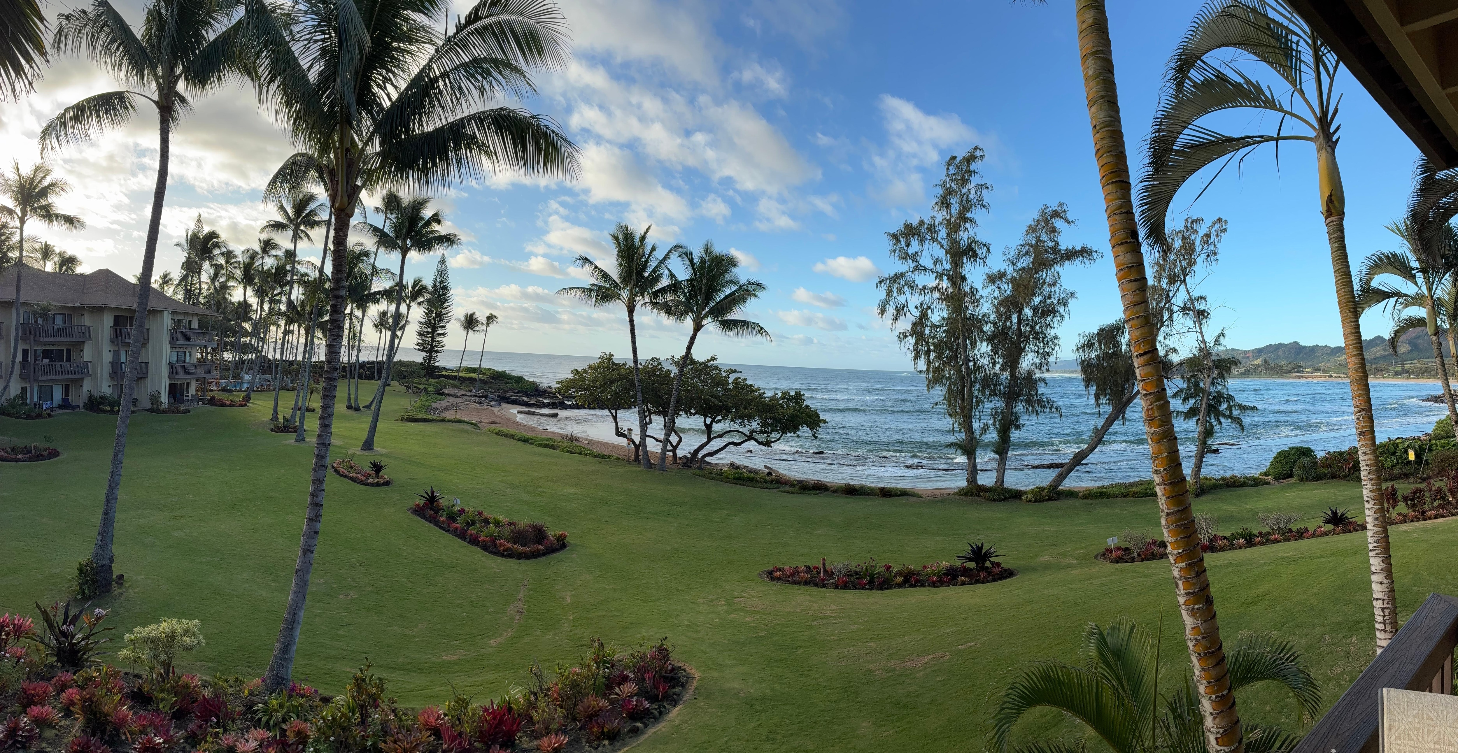 The view from our balcony was fantastic ~ looking over the beautiful grounds & gardens to the beach & surf was the highlight of every day! The resort is within a few minutes walk of shopping & restaurants.
