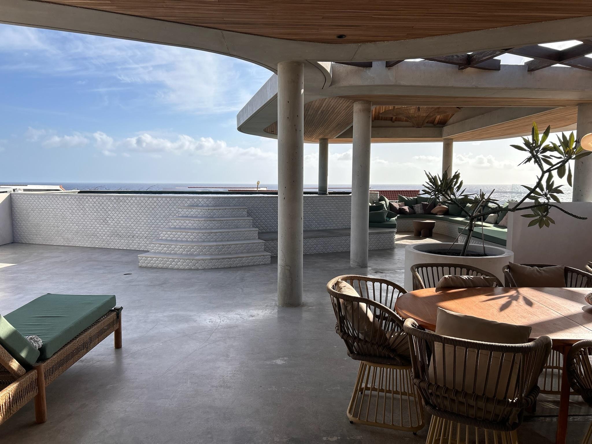The terrace unfolds with panoramic sea views and a sculpted wooden overhang that provides both shade and style. Beneath the palapa, the signature Villa Aya lamp casts a soft glow. Large mattresses and layered cushions invite you to unwind and take in the spectacular, multicolored sunsets. The pool features outer walls tiled with Art Deco inspired scallop motifs, a shallow lounging zone, in-water bar stools, and a finish of emerald green and blue Balinese Sukabumi stone that gives the water a luminous shimmer. Woven sunbeds and a generous dining table with comfortable designer chairs set the tone for long, relaxed evenings outdoors.