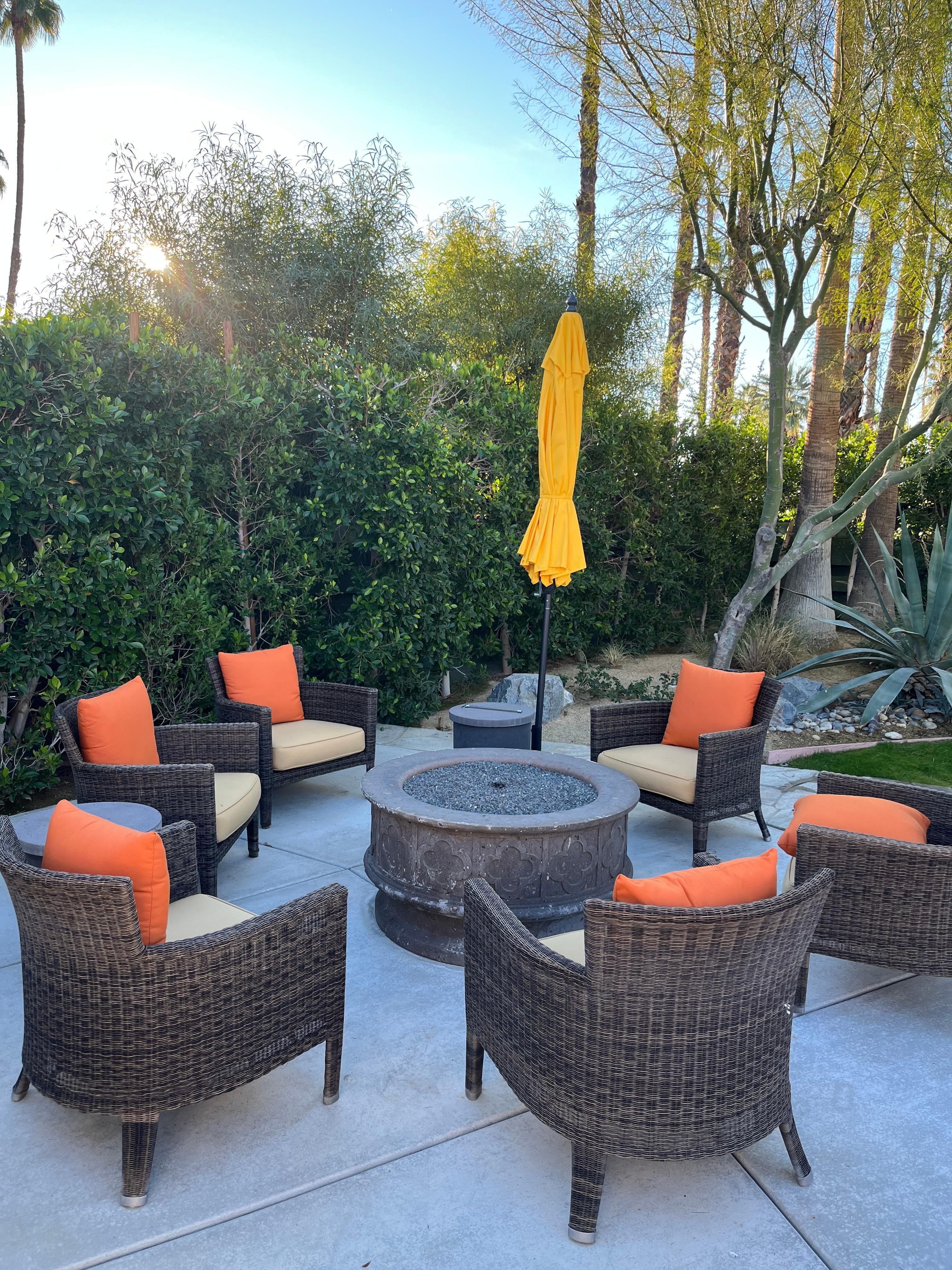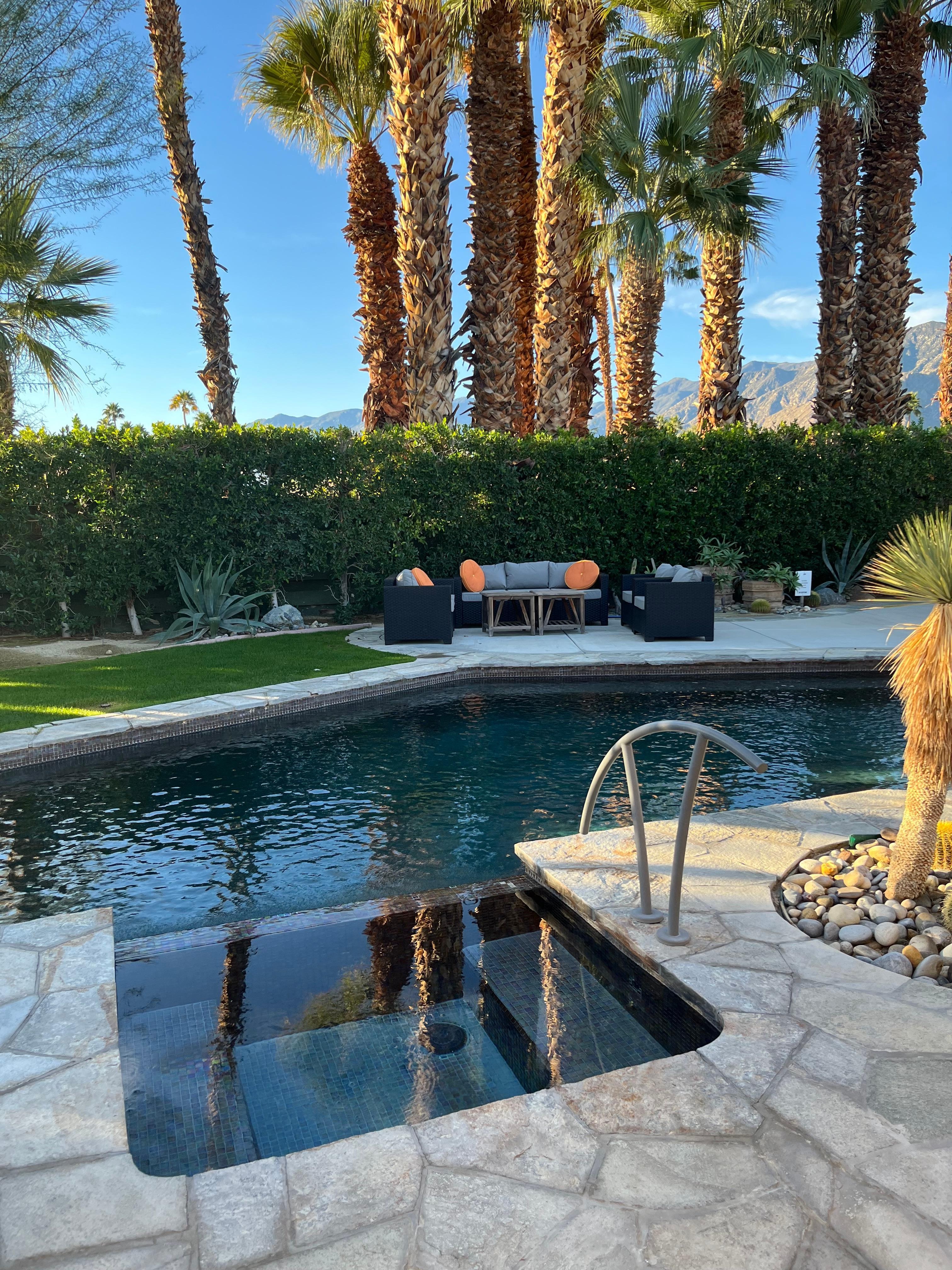 Der Hof besteht aus einem neuen Salzwasserpool und einem Spa mit ägyptischen Glasfliesen. Es gibt mehrere Sitz- und Loungebereiche im Freien, darunter einen schattigen Essbereich, ein Wohnzimmer im Freien, eine Tiki-Hütte für Cocktails oder Zigarren, Liegestühle am Pool für 4 Personen und entspannende Liegestühle um eine speziell geschnitzte Feuerstelle aus Mexiko. All dies ist von atemberaubendem Bergblick und kalifornischen Fächerpalmen umgeben und wird von einem Nebelsystem gekrönt, das Sie unter der Wüstensonne kühl hält.