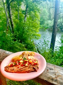 Das Miner's Landing ist eine fabelhafte Flussfelsen-Terrasse mit einer Feuerstelle und einem Grill direkt am Fluss. Was schlägt ein Feuer und beobachtet die Sterne am Nachthimmel?