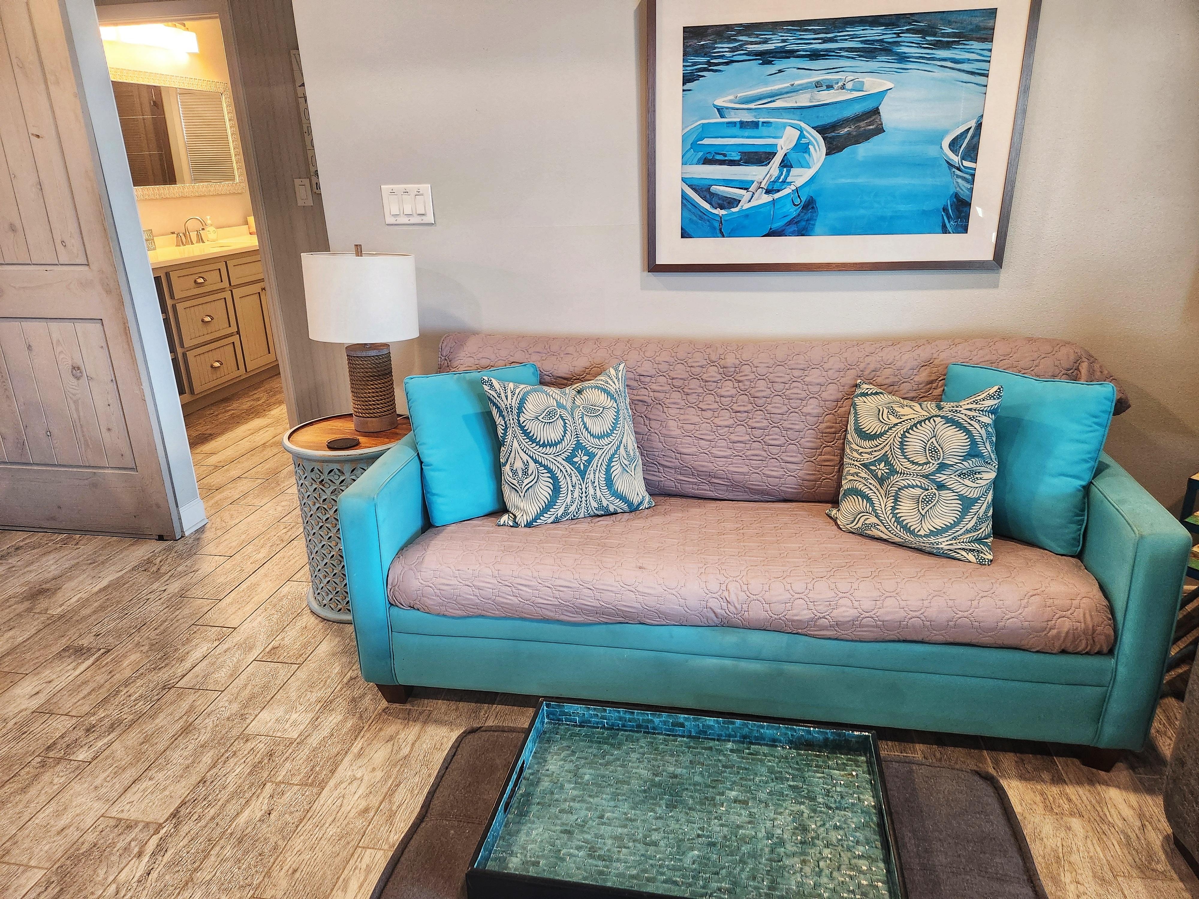 Jeder Schlafzimmerflügel verfügt über 2 Schlafzimmer mit einem großen Badezimmer zwischen den Schlafzimmern. Ein Queensize-Schlafsofa befindet sich im Wohnbereich.