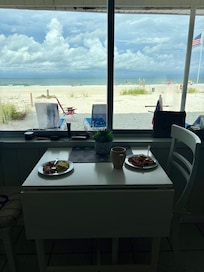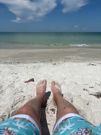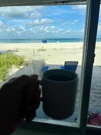 This property is so special because it is quaint, old Florida style and located directly on the beach - ranch style with NO STAIRS and a covered parking space 10 feet from your door, so that you can literally have your suitcase in your bedroom and on the beach in 10 minutes! We love this location on the beach because it is more private and the ocean is so clear and turquoise blue/green! We have updated the kitchen/living room to make it an open floor plan with white shaker cabinets, a full-size stainless steel appliance package and granite counters and breakfast bar. The bathroom is also totally remodeled with a walk-in shower and comfort height toilet. All off the furniture, bedding, kitchen accessories, etc. are brand new - as well as 2 flat screen TV's (ROKU in living room and Alexa) and high-speed wireless internet. You will love watching the sunset from the covered front porch or inside at the kitchen table - or start the day with a cup of coffee from either place!