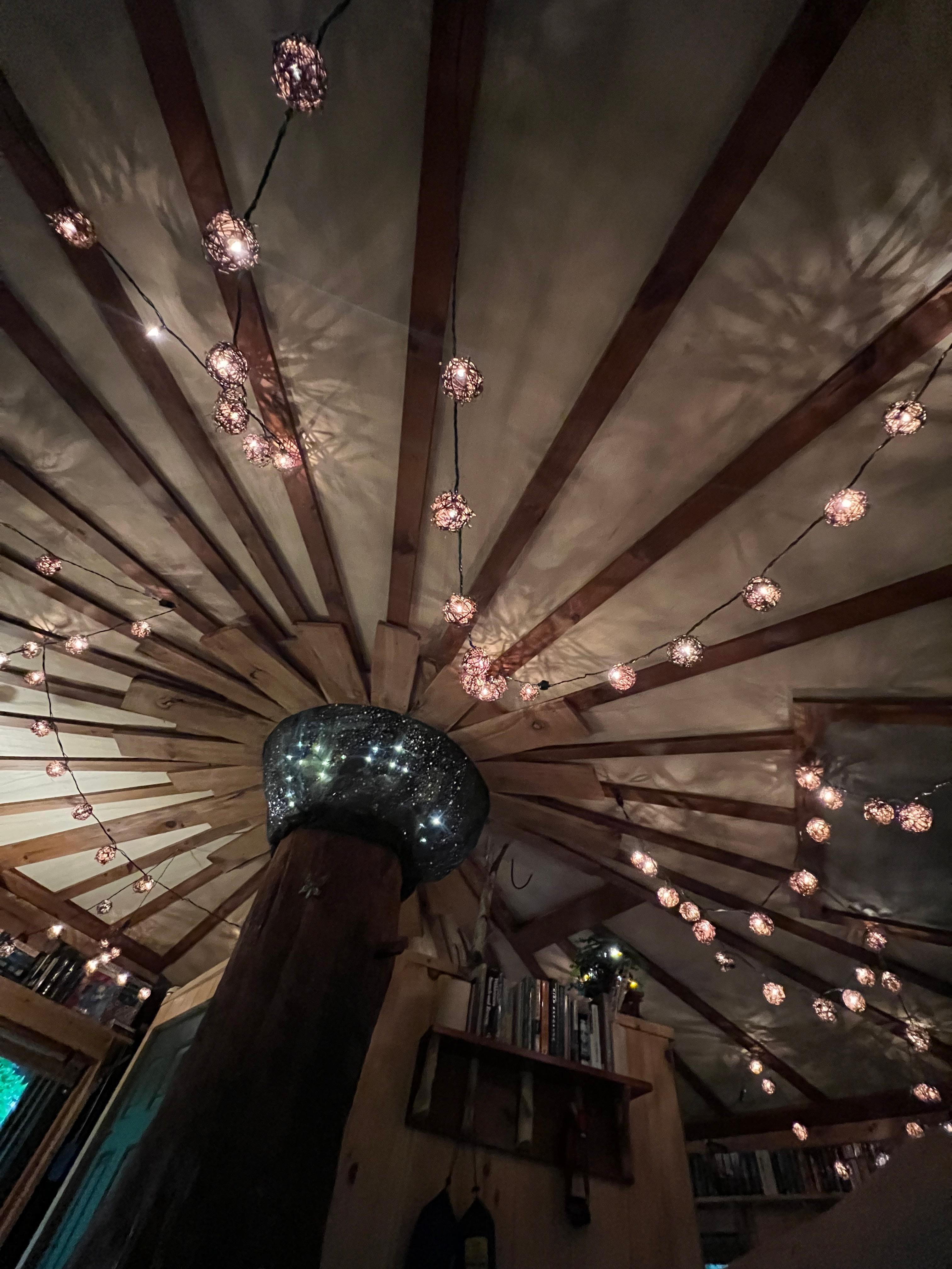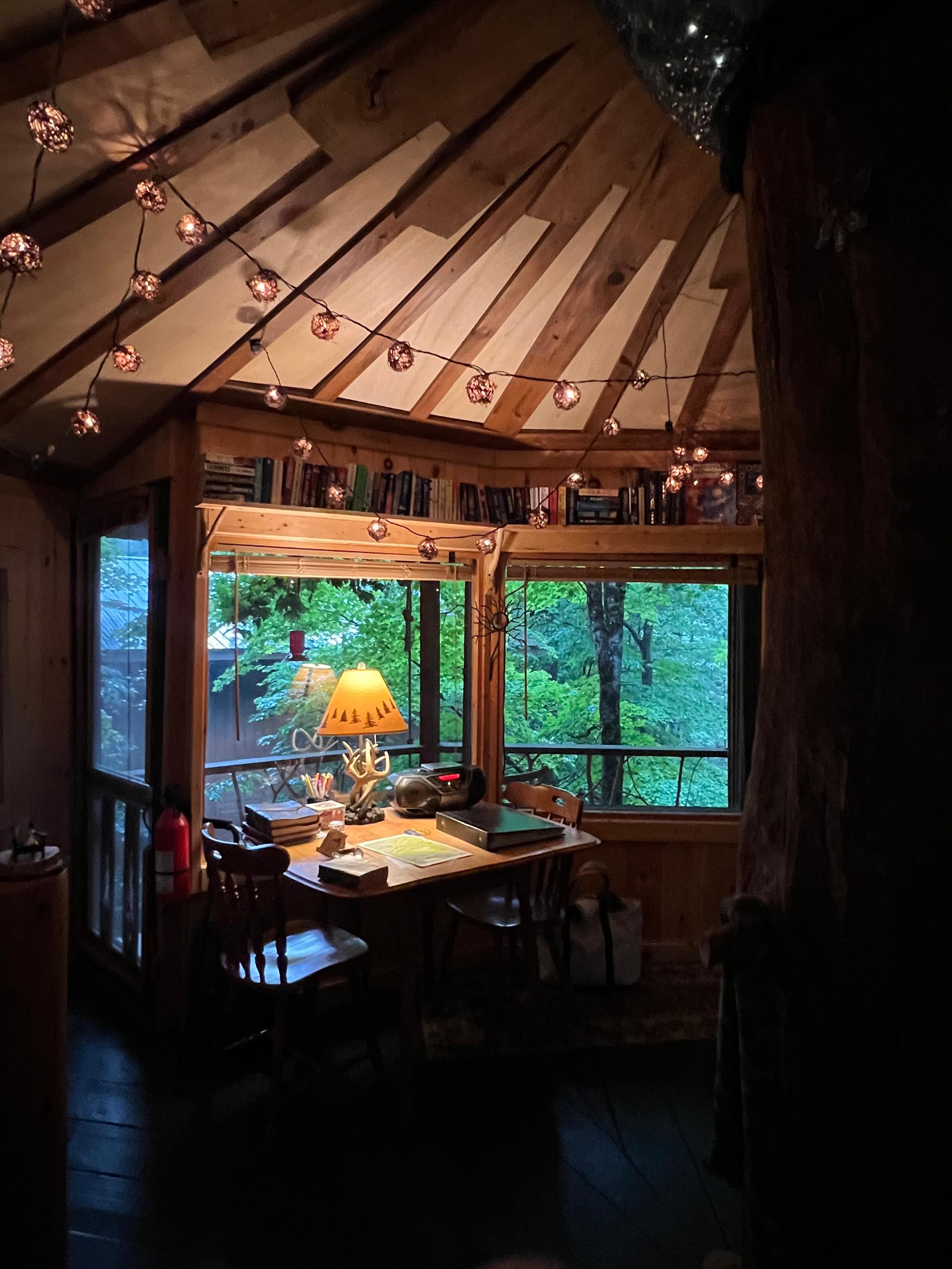 Bleiben Sie in unserem gemütlichen Baumhaus auf dem Boden. Ein kreisförmiger Raum, der die perfekte Basis für Ihr nächstes Abenteuer ist - oder ein einzigartiger Ort, an dem Sie sich mit einem guten Buch entspannen können. In der Nähe unseres Hauses ist dies der perfekte Ort, um im Wald zu sein, aber nicht isoliert. Kochen Sie Ihre Mahlzeiten im nahe gelegenen Kochhaus auf einem Campingofen oder bei einem offenen Lagerfeuer. Ein Badezimmer mit Dusche ist in unserem Bürogebäude vorhanden. Wir bieten Ihnen Bettwäsche und Handtücher sowie Hilfe bei der Planung Ihrer Reise. Das Anwesen umfasst Meilen von Wanderwegen!