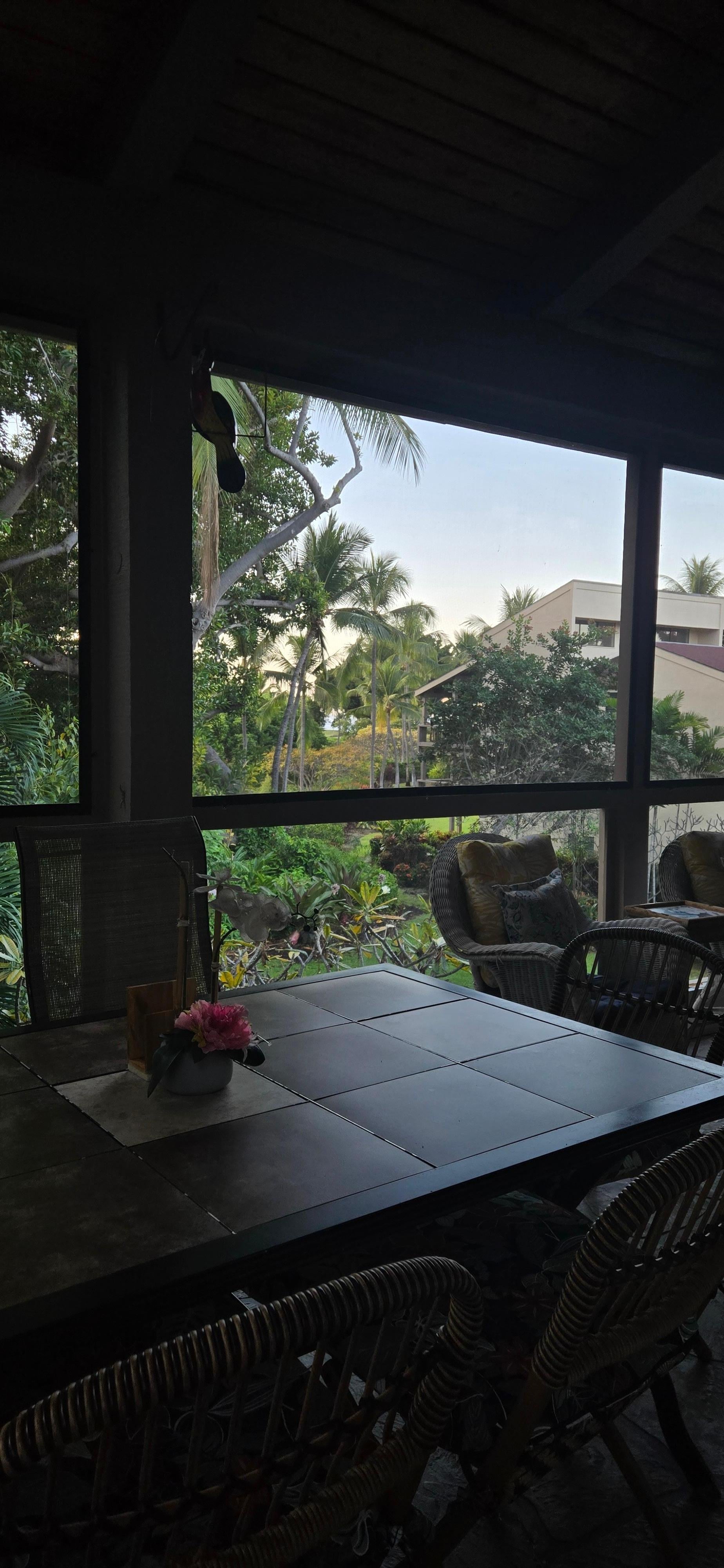 Die Einheit Nr. 8-304 ist eine Eckeinheit, daher gibt es einen erweiterten Lanai-Bereich mit einem Screened in Lanai mit hohen Gewölbedecken und mehreren Ruhebereichen. Es ist sehr privat und hat das GefĂŒhl, in einem tropischen Wald zu sein. GroĂe BĂ€ume verschlingen die Ostseite des GebĂ€udes und sorgen dafĂŒr, dass das GerĂ€t kĂŒhlere Temperaturen als die anderen im Komplex hat.