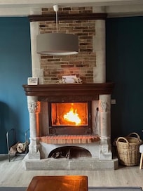 Das Wohnzimmer verfĂŒgt ĂŒber einen Kamin und das Wohnzimmer.
