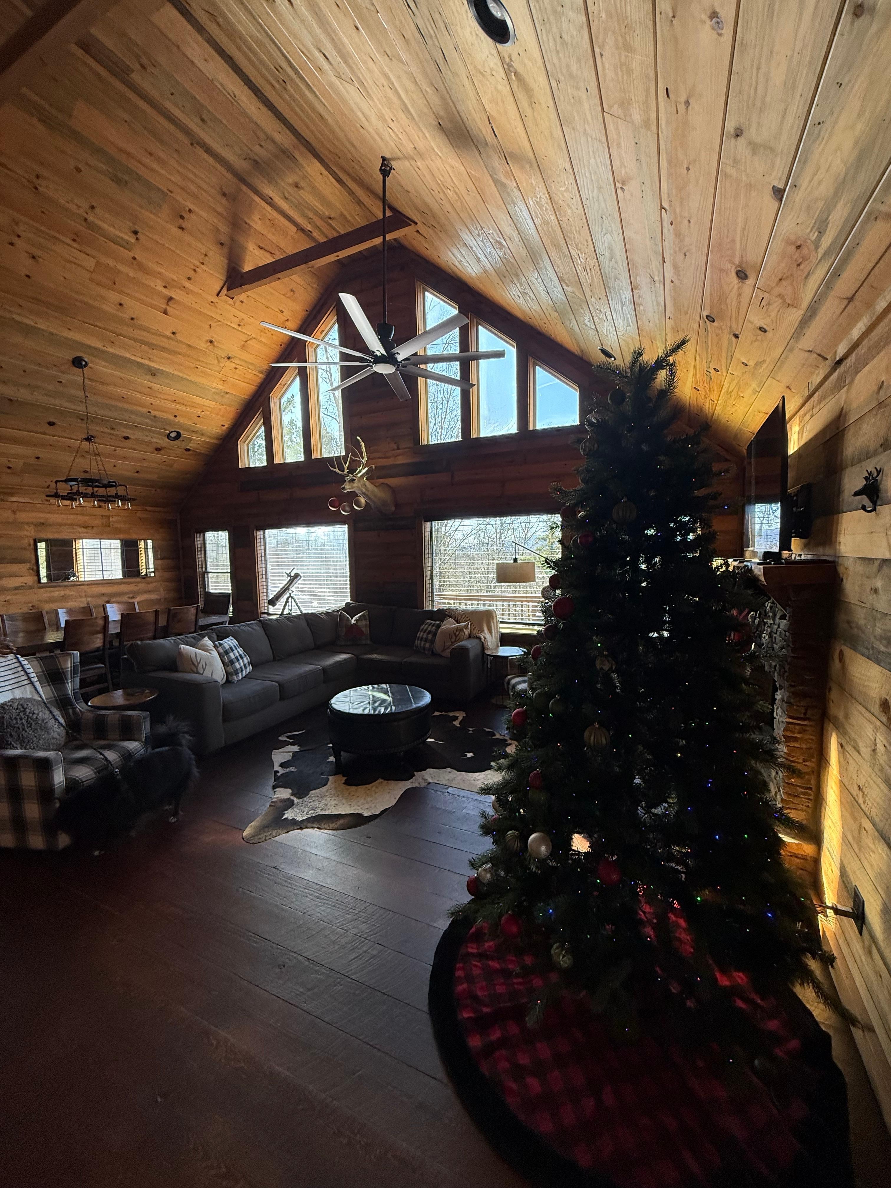Im Inneren der Hauptebene befindet sich ein geräumiges Wohnzimmer mit einem 50-Zoll-4K-Smart-TV, einem Holzkamin, einem Esszimmer mit einem unglaublichen 2 m langen Esstisch und einer großen Küche mit allen Geräten, die die Köchin der Familie jemals brauchen könnte herrliche Aussicht aus der Wand der Fenster. Ein Vollbad und eine Wäscherei sowie ein Schlafzimmer mit einem wunderschönen schmiedeeisernen Queensize-Bett und einem handgefertigten Holzetagenbett schließen die Hauptebene ab.