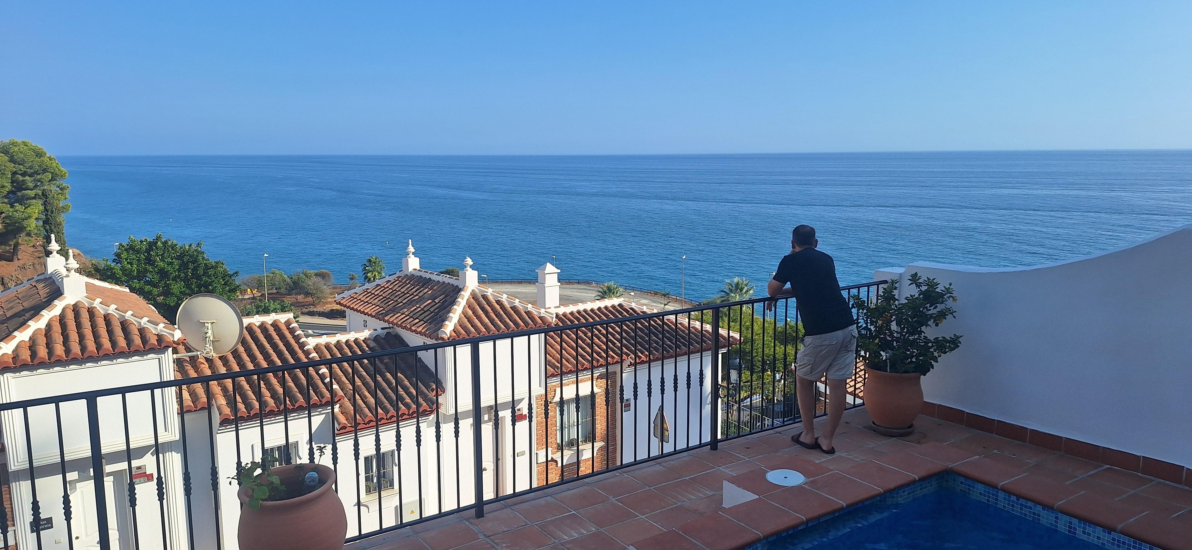 Im Obergeschoss befindet sich ein großes Doppelzimmer mit Zugang zu einer privaten Terrasse, auch mit herrlichem Meerblick, ein zweites Schlafzimmer mit zwei Einzelbetten und ein Badezimmer mit Dusche, wo die Waschmaschine ist.