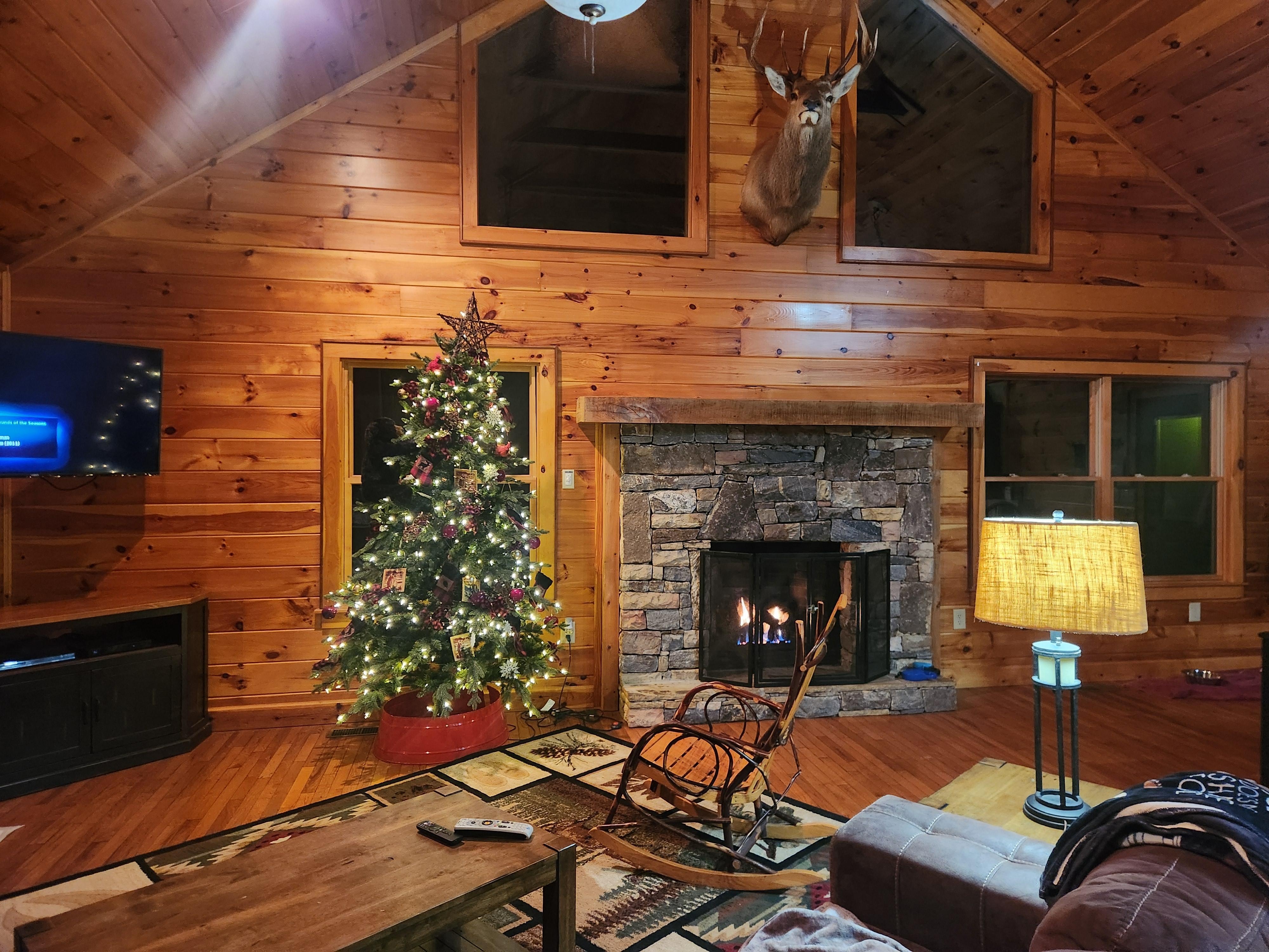 Der große Raum im Erdgeschoss führt zum Open-Air-Deck mit Fernblick auf den Great Smoky Mountains National Park. Das geräumige, großartige Zimmer mit Massivholzböden verfügt über einen HD-Sat-TV, einen Gaskamin und einen geräumigen, gemütlichen Wohnbereich. Das offene Küchendesign grenzt an den Essbereich mit viel Platz zum Kochen und Servieren. Das Hauptschlafzimmer verfügt über Glastüren, durch die Sie im Kingsize-Bett viel frische Bergluft genießen können. Das Hauptbad verfügt über eine Whirlpool-Badewanne und eine separate ebenerdige Dusche. Das halbe Bad ist in der Nähe der Küche und ein tolles Zimmer.