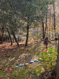 Our home has 3 bedrooms and 3 full baths. The Primary bath has an additional clawfoot tub. The Primary bedroom is quite large with fresh carpet and a very comfortable mattress. There are 4 beds total: 2 King & 2 Full (an additional inflatable mattress and “pack’n’play” are also available). We have a full laundry room and supply closet, a screened-porch, fully equipped kitchen, dining area, and ample room between the fireplace and living area. There’s also a charcoal/kamado grill above the fire pit, nestled along the driveway.
