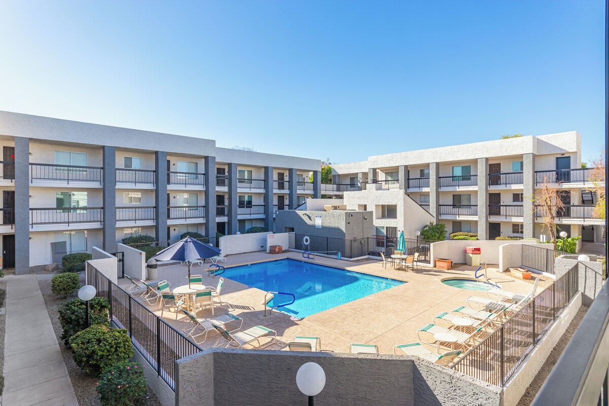This fully furnished 2 bedroom 2 bathroom Old Town Scottsdale Condo in a gated community is within walking distance to old town. Enjoy the heated pool & hot tub. The condo in Casa Requena II is close to restaurants, art galleries, golfing and shopping in Fashion Square. 2 blocks from the Scottsdale Giants Stadium and Civic Center Park. Close to hiking and biking trails. Washer/Dryer in unit. WiFi and utilities are included. Covered parking.