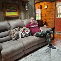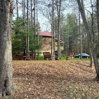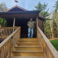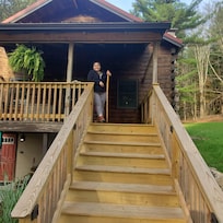 - Single-story cabin, exterior steps to enter