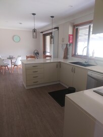 Bring the whole family to this great place with lots of room for fun. It has the perfect location for a holiday. It is within walking distance to the harbour and to shops and restaurants. Just a few minutes drive to beaches. A large backyard with room to kick a footy, with a great covered patio out back. Just sit back and relax.