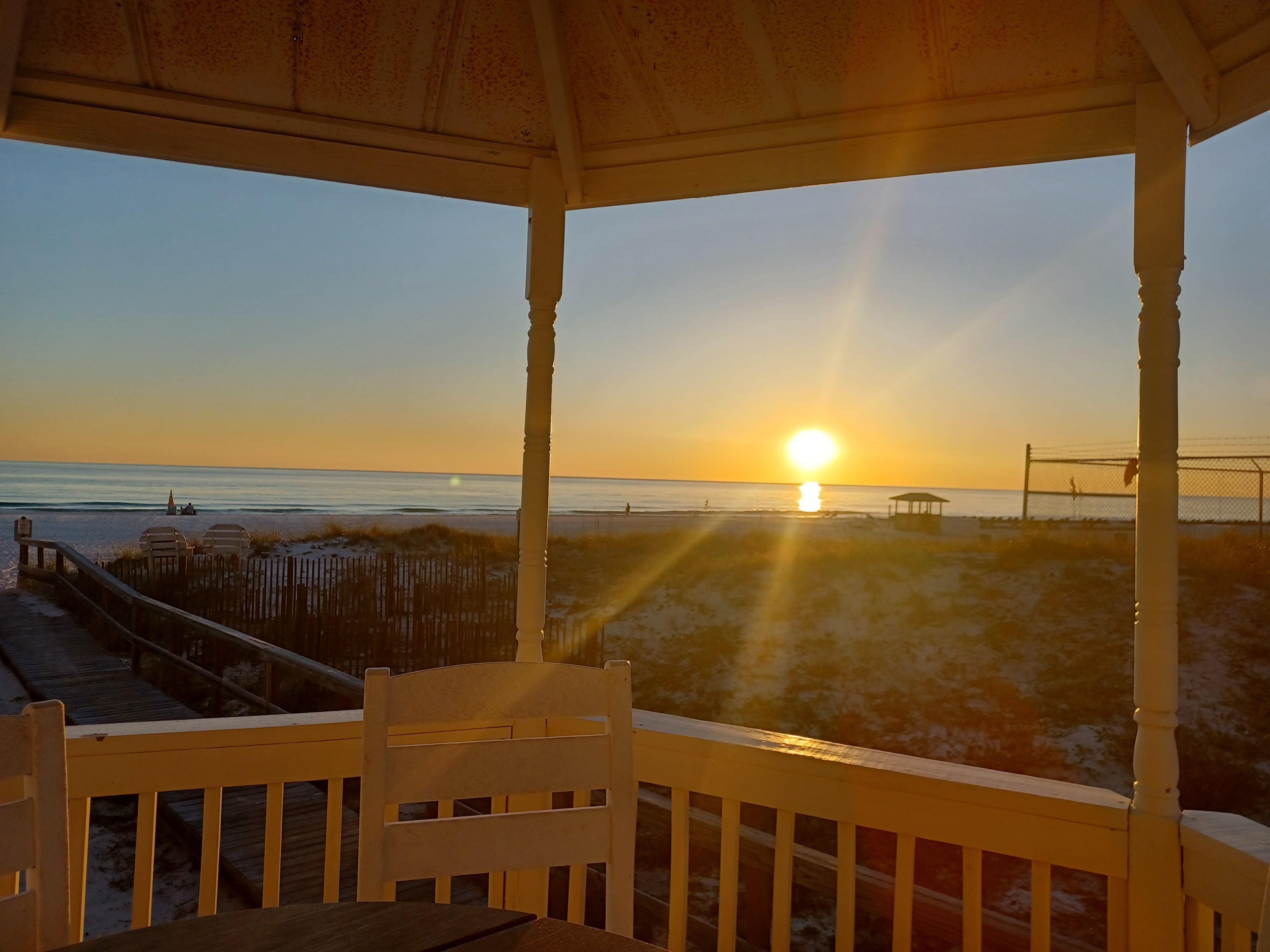 Nearby, the kitchen features gleaming granite countertops and stainless-steel appliances, plus all the pots, pans, dishes and tableware you need to enjoy anything from a simple snack to a gourmet meal. There’s even a Keurig machine and blender. Enjoy your meals in the dining area while enjoying the Gulf view or have dinner on the deck. There is a gas grill that is perfect for cookouts. A charming gazebo provides additional shade from the sun, while the outdoor shower lets you wash off the sand as you go back and forth to the beach during cookouts.