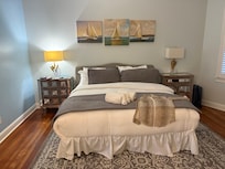 Bedroom 1: King bed, smart TV, en suite full bathroom with tub/shower
