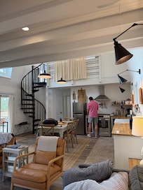Inside, the thoughtfully designed space greets you with vaulted ceilings, natural light, and cozy touches that make you feel instantly at ease. The open-concept living room is the heart of the home, featuring a plush queen-size sleeper sofa, three stylish club chairs, and a large streaming TV—perfect for unwinding after a day of exploring. An electric fireplace adds just the right amount of ambiance, whether you're curling up with a book or enjoying a movie night.