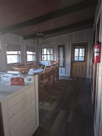 On the lower level, the Mystic Suite adds a queen bed as well as a queen pull-out sleep sofa in the sitting area. This suite has a country modern feel with an eclectic combination of antiques and collected pieces. A fully equipped kitchen comes outfitted right down to the salt, pepper, sugar and Splenda. This unit also has it's own entrance and a wrap around porch.