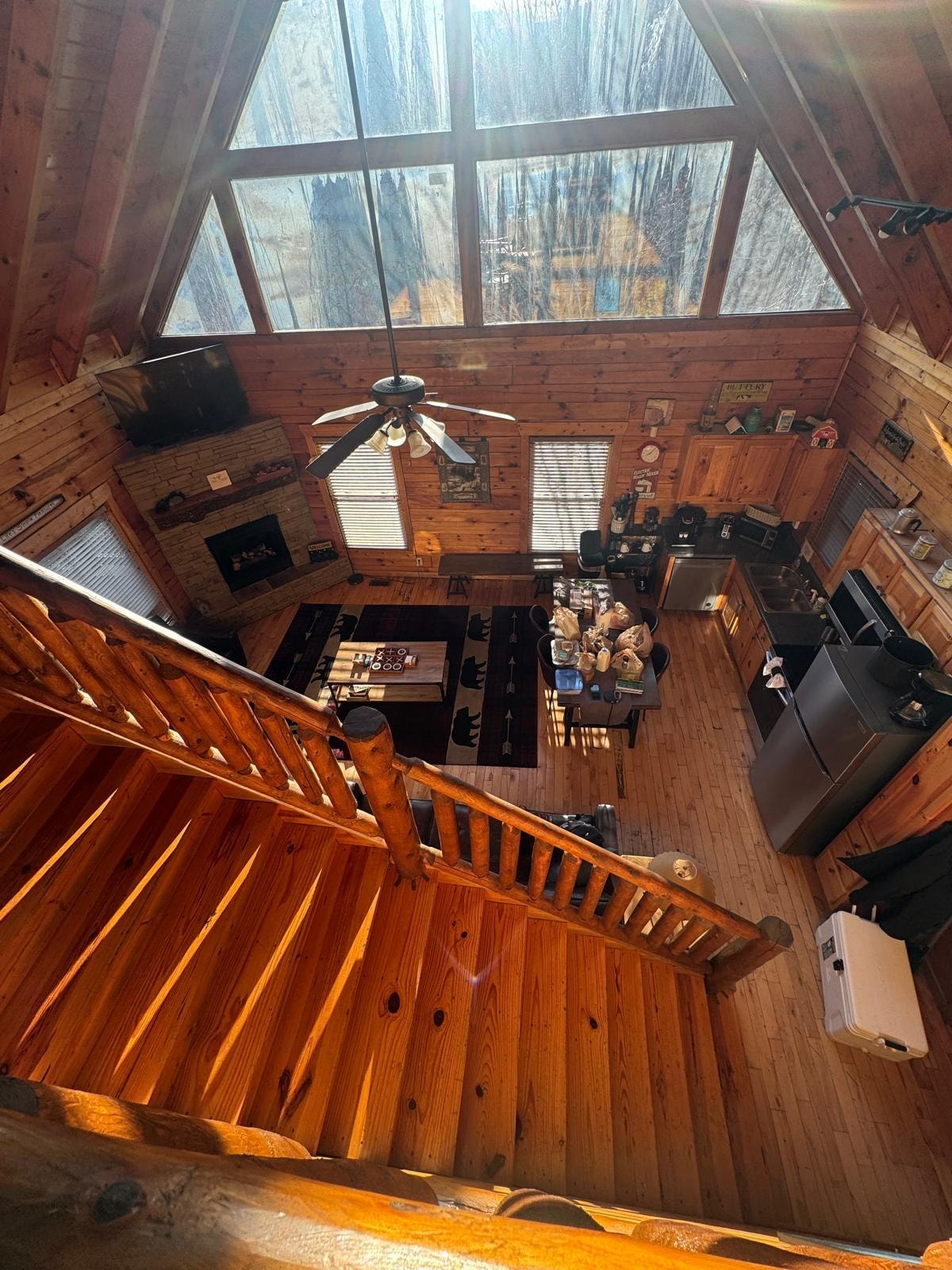 The vaulted ceiling and large viewing windows give this cabin a "Big Lodge" feel.