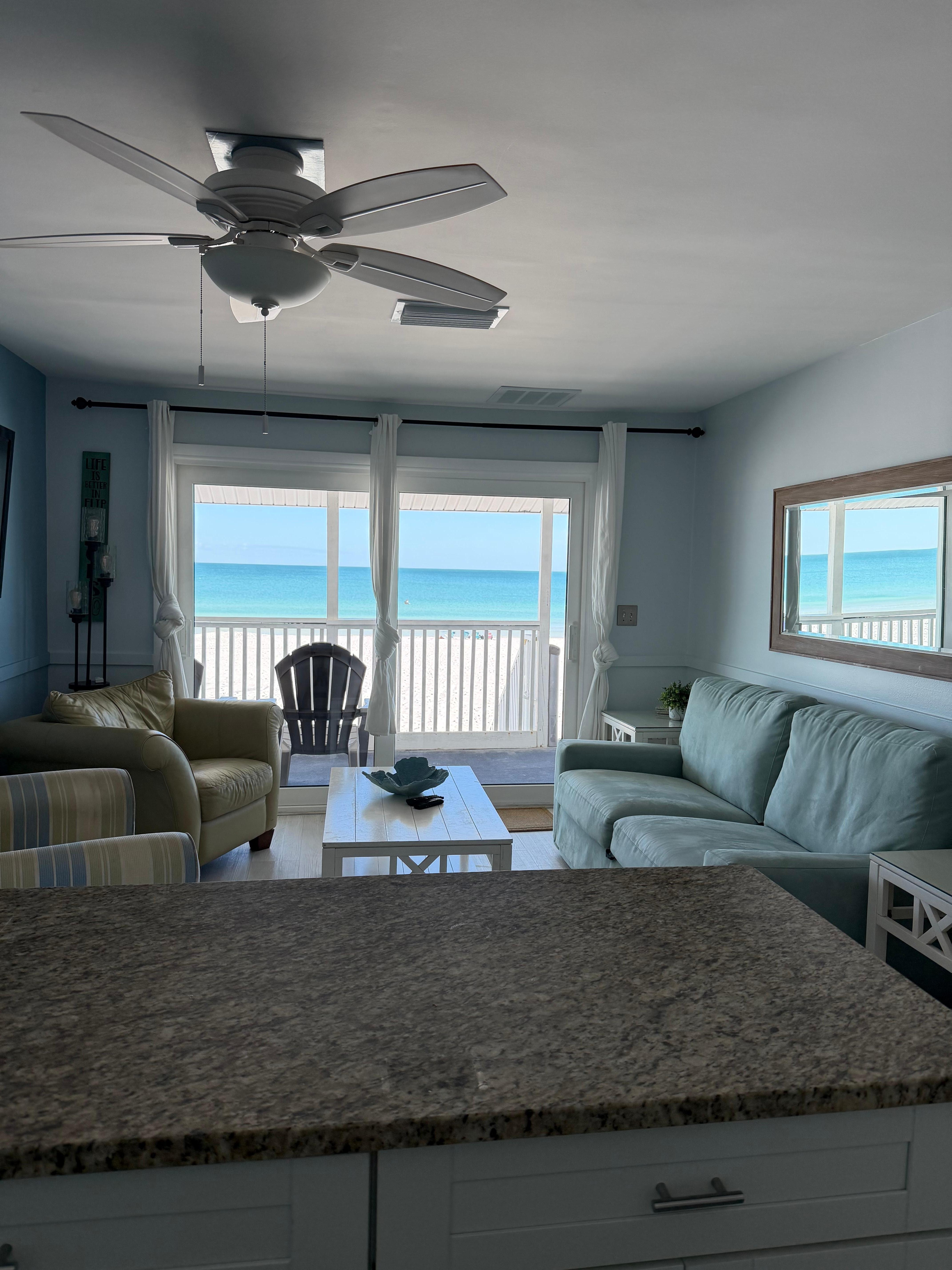 Discover your dream vacation at this exquisite, newly renourished, private beachfront condo in Indian Rocks Beach! Just 15 steps to the sand, with mesmerizing views of the Gulf of Mexico and its incredible sunsets. Explore nearby bars and restaurants for a complete vacation experience. This condo is the perfect escape for families and anyone looking for a relaxing beach getaway. Beach gear including towels, chairs and umbrellas included!