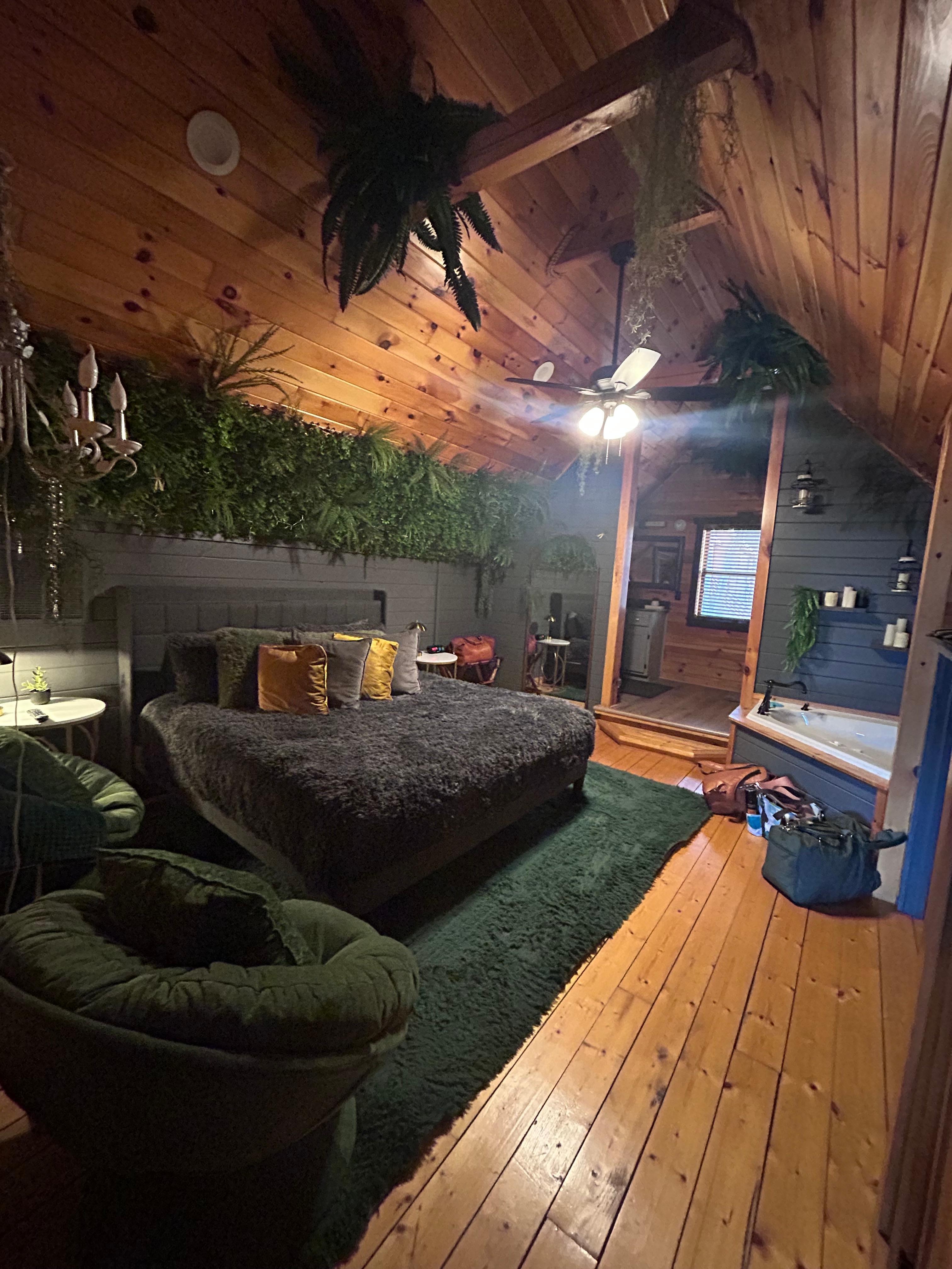 Cozy Cub Retreat is a modern cabin with a designer feel: cathedral ceilings, a frosted white fireplace, a statement chandelier over the dining area and bedrooms that feel like private suites. The primary forest-inspired king room is especially atmospheric at night, with layered lighting and a soft, tucked-away mood that suits both early nights and slow mornings.