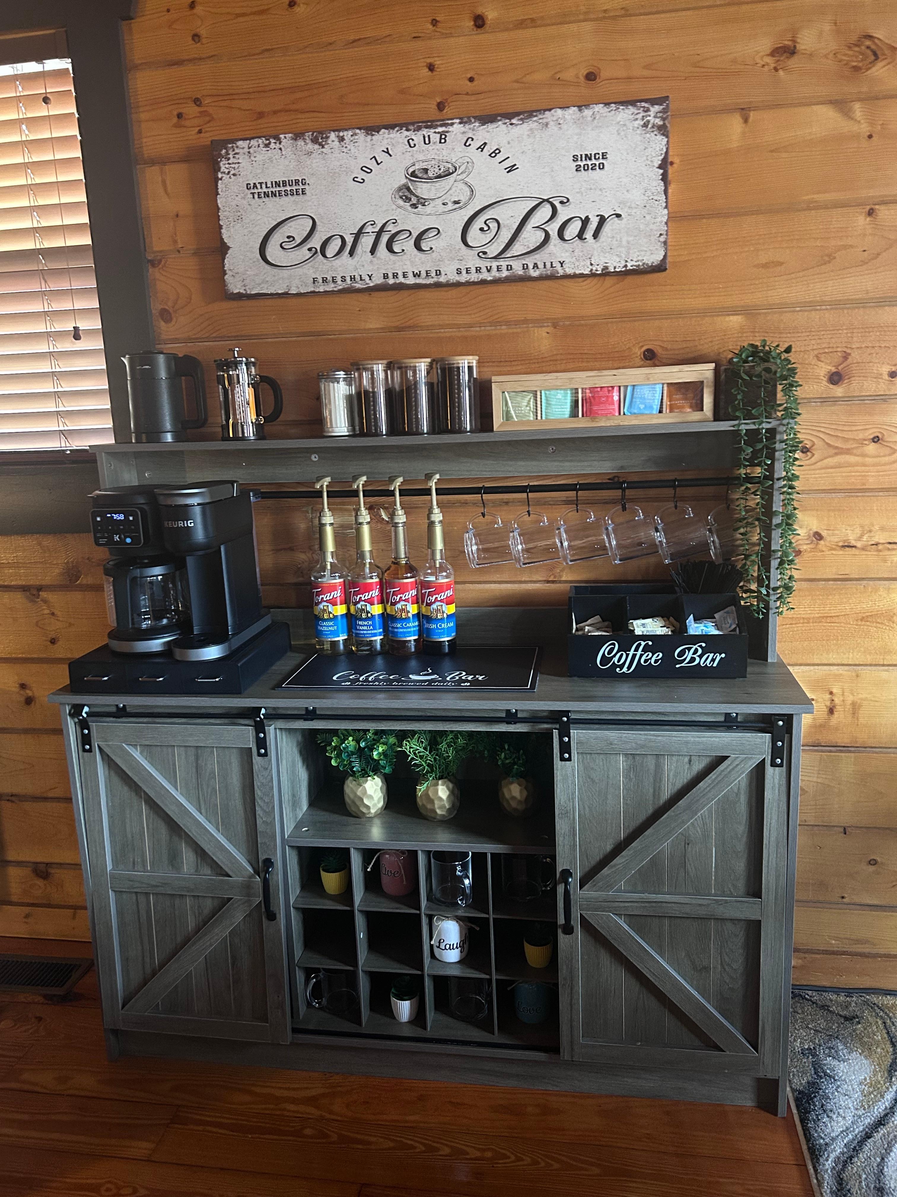 * Full coffee bar with flavored Keurig pods, fresh ground coffee, dual coffee/K-Cup maker, French press, electric kettle, flavored syrups and teas