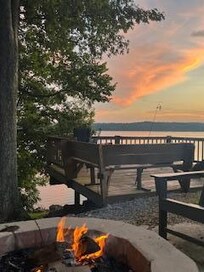 Gather the family in the basement TV room and relax in the comfy reclining couches. What a great place for a movie night or enjoying a game on the big screen. The downstairs level features a Twin XL over Queen Bunk bed, a Queen size Murphy cabinet bed and a Queen size private bedroom. There is also a laundry room with a full size washer, dryer and laundry sink. This level has its own bathroom with shower. Exit from the basement to the lower covered deck. An outdoor shower with hot and cold water is available for rinsing off after a day at the lake. From there it's just a short walk to the fire pit and another large sun deck that overlooks the water. Take a stroll down the waterfront path that leads to a spacious landing area. Lounge, swim and enjoy!