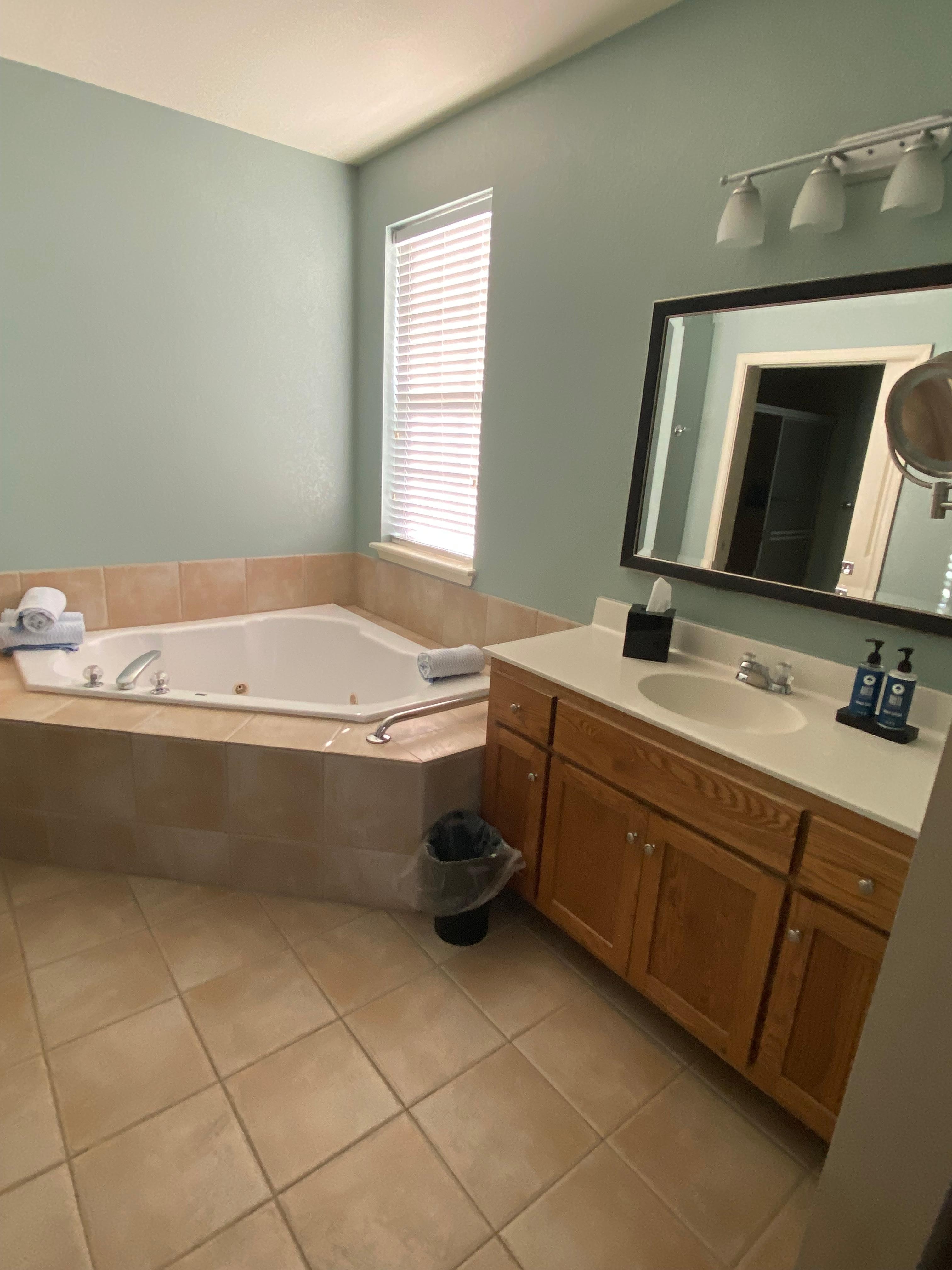 We enjoyed our stay, the unit was very clean and we had all we needed for our vacation. There is plenty of space for storage, beds were very confortable, love the jacuzzi and the amenities. Great location short drive to attractions. We will definitely be back.