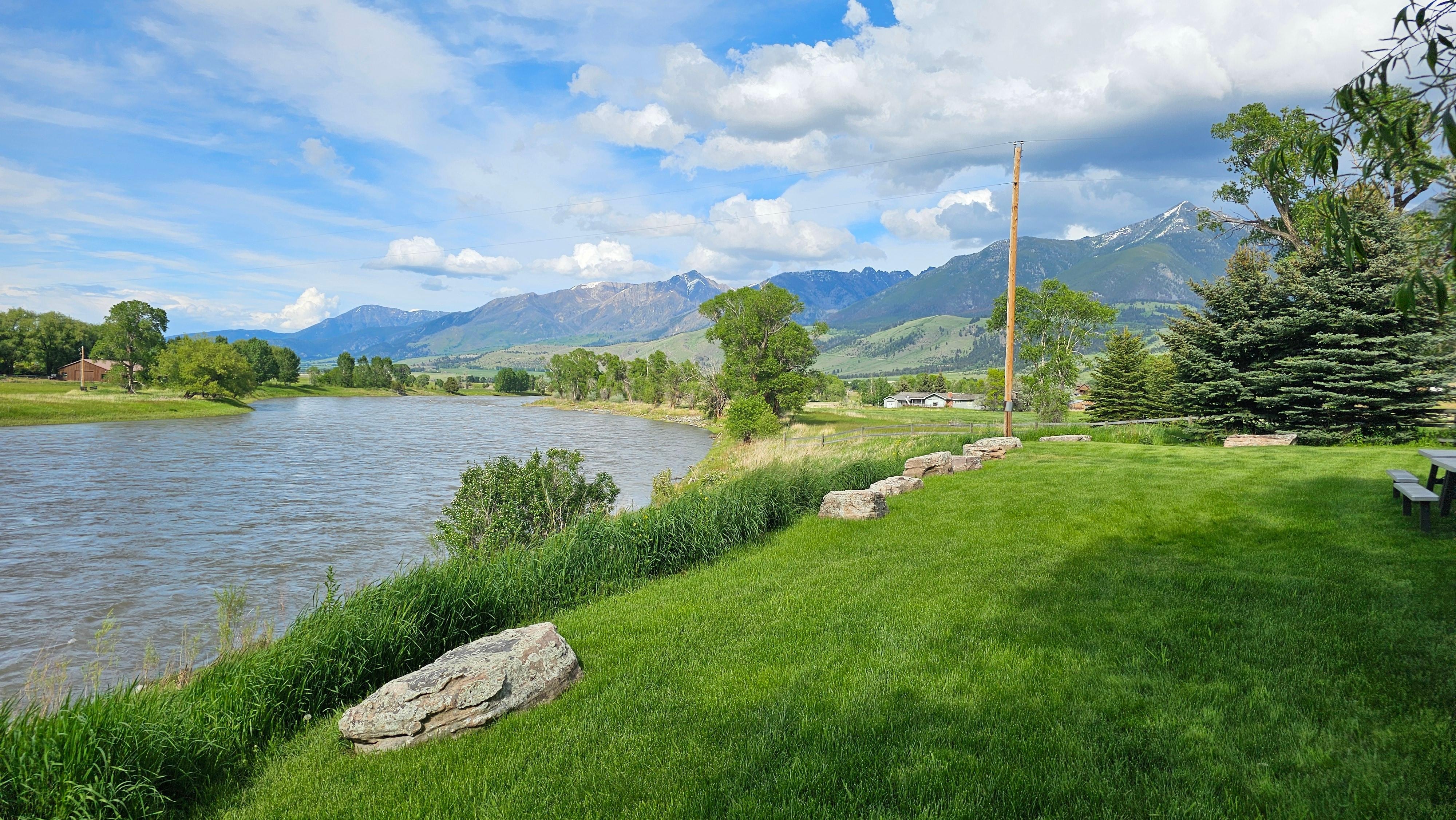 Unser Außengelände ist privat und abgeschieden und bietet schöne Gärten, große Rasenflächen mit viel Platz für Spiele und Kinder, einen Picknicktisch, eine Terrasse mit Essbereich und einen Grill ... alles nur einen Katzensprung vom angrenzenden Yellowstone River entfernt die Tür und werfen Sie eine Linie in! Von besonderem Interesse für unsere vielen besuchenden Fischer und Jäger ist das "Hideout", ein separates Gebäude, das speziell zum Fliegenbinden, Lagern von Ausrüstung oder zur Unterbringung von Jagdhunden in den Zwingern vor Ort dient (auf Anfrage erhältlich).
