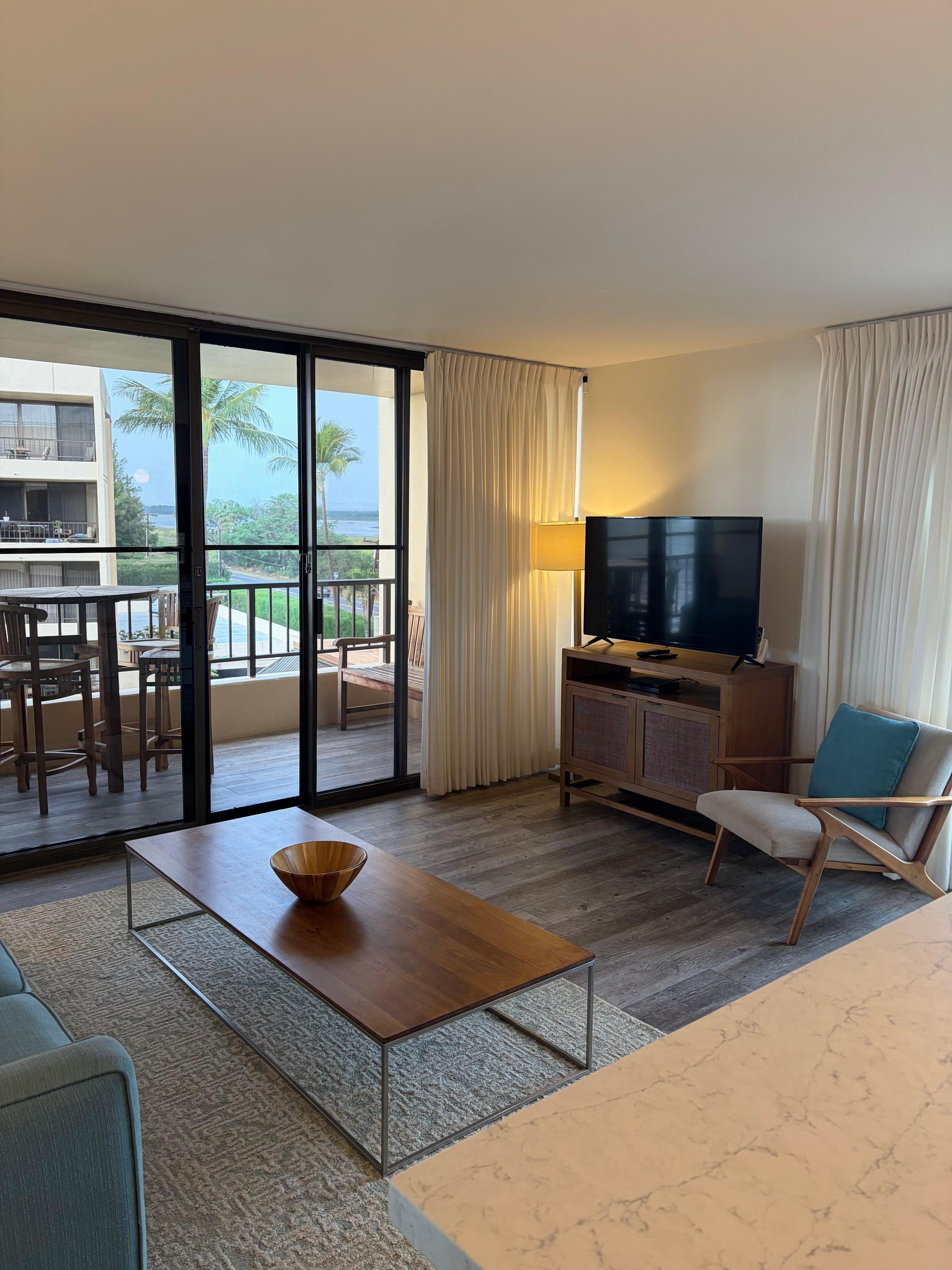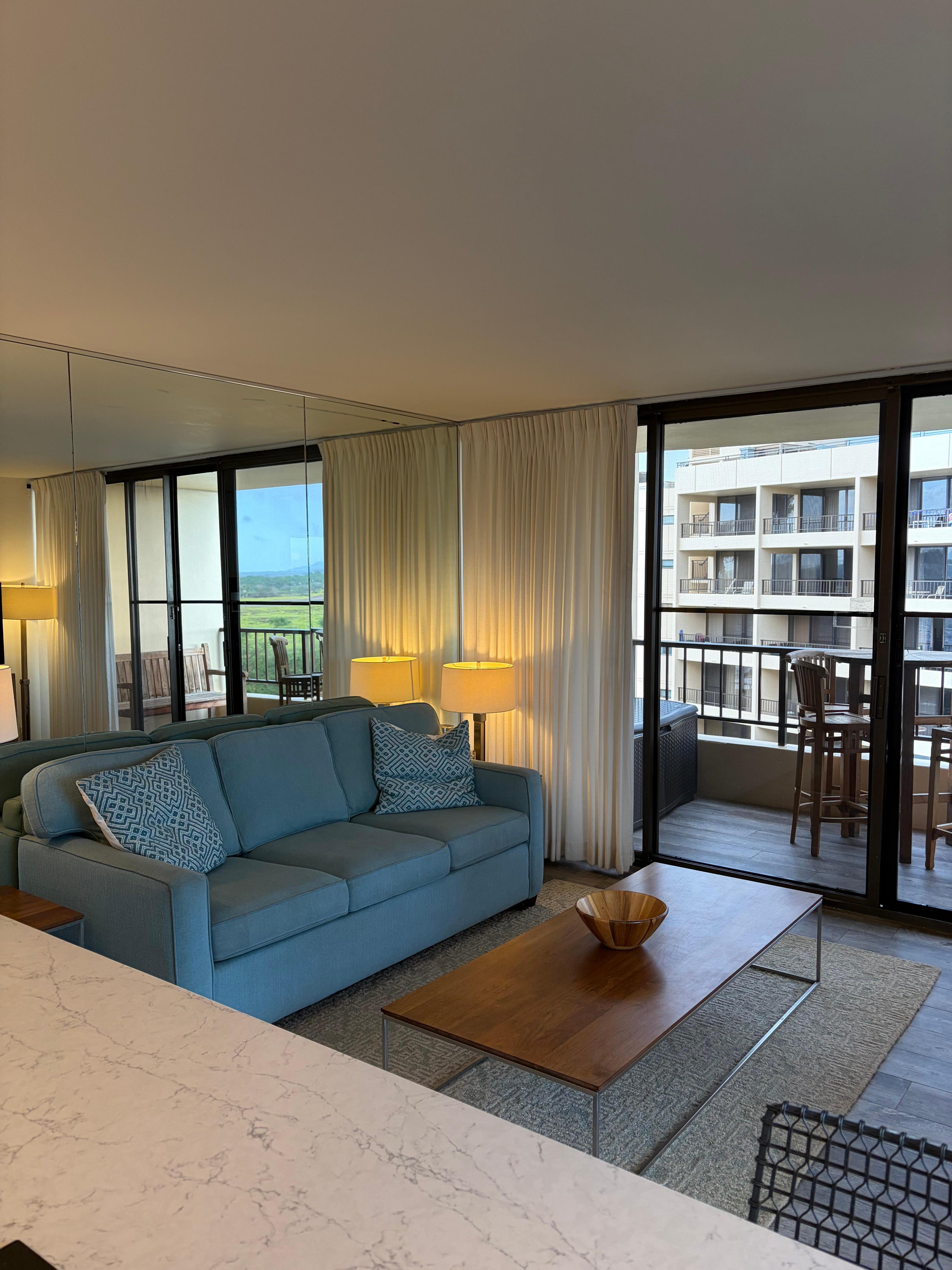 Once inside, this well appointed condo has been tastefully updated to truly exemplify a modern, tropical vibe. The generously-sized kitchen features new stainless steel appliances, an outward facing cooktop to ensure you never miss that ocean-view, and a gorgeous quartz countertop with a built-in breakfast bar. The living room flows from the kitchen and features a high-end pullout sofa, flat-screen TV with cable, and high-speed internet. The oversized lanai features a dining table for four with panoramic ocean, mountain and lagoon views. From this unit you can see the breath taking views of Kealia Pond.