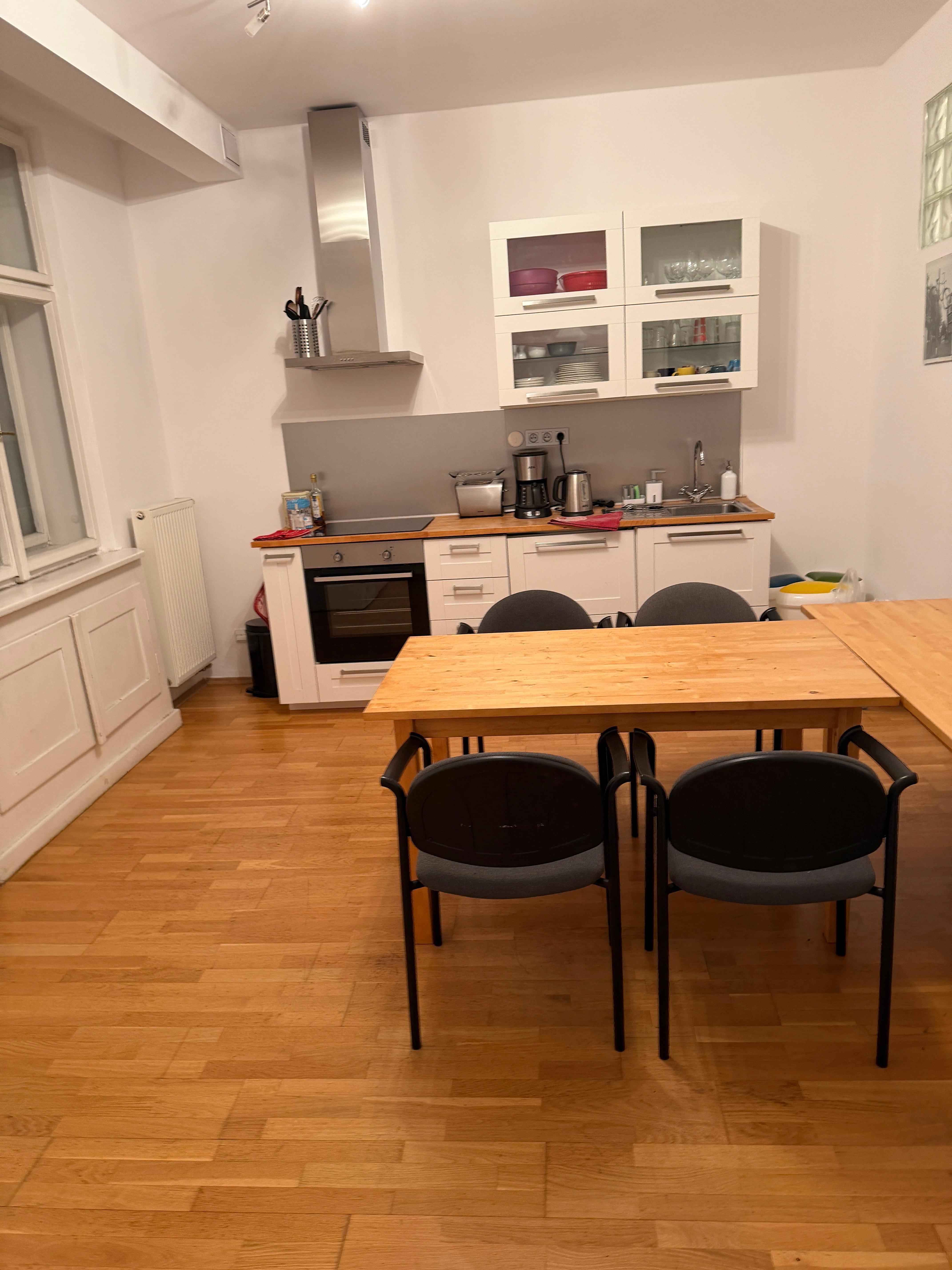 Die 2-Zimmerwohnung mit großer Küche, 2 Toiletten, einem Schlafzimmer und einem Wohnzimmer ist 80 qm groß. Sie liegt im Stadtteil Vrsovice, gleich neben dem Stadtteil Vinohrady neben einem wunderschönen Park. Die Anbindung zum Stadtzentrum ist ideal. Die Straßenbahnhaltestelle ist nur 3 Minuten von der Wohnung entfernt und man fährt in 15 Minuten direkt in das historische Zentrum von Prag. Die Prager Metro ist ebenfalls in wenigen Gehminuten zu erreichen. Die Wohnung befindet sich im 4.Stock, Ein Aufzug ist vorhanden. In der Wohnung können bis zu 5 Personen übernachten. (Es gibt ein Doppelbett und ein Einzelbett im Schlafzimmer und eine Ausziehcouch im Wohnzimmer, auf der 2 Personen schlafen können.)