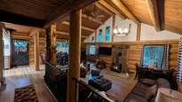 Inside, the sunken living room with soaring logs, beams, and hardwood floors invites you to pause, relax on cozy couches, or curl up in the leather chair with ottoman by the new gas woodstove. The large dining area, complete with a whimsical âantler bar,â opens to a fully equipped kitchen and back Dutch door to the BBQ. Outside, enjoy dining under the trees, gather around the campfire pit, or simply breathe in the fresh air.