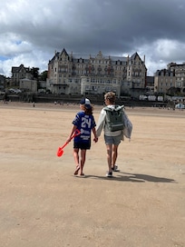 Dank der ausgezeichneten Lage am Strand ist dieses Apartment zu Fuß gerade mal 5 Minuten entfernt von: Großer Strand und Strände in der Bretagne. Ebenfalls höchstens 10 Minuten entfernt: Plage de Longchamp und Pointe du Décollé (Aussichtspunkt).