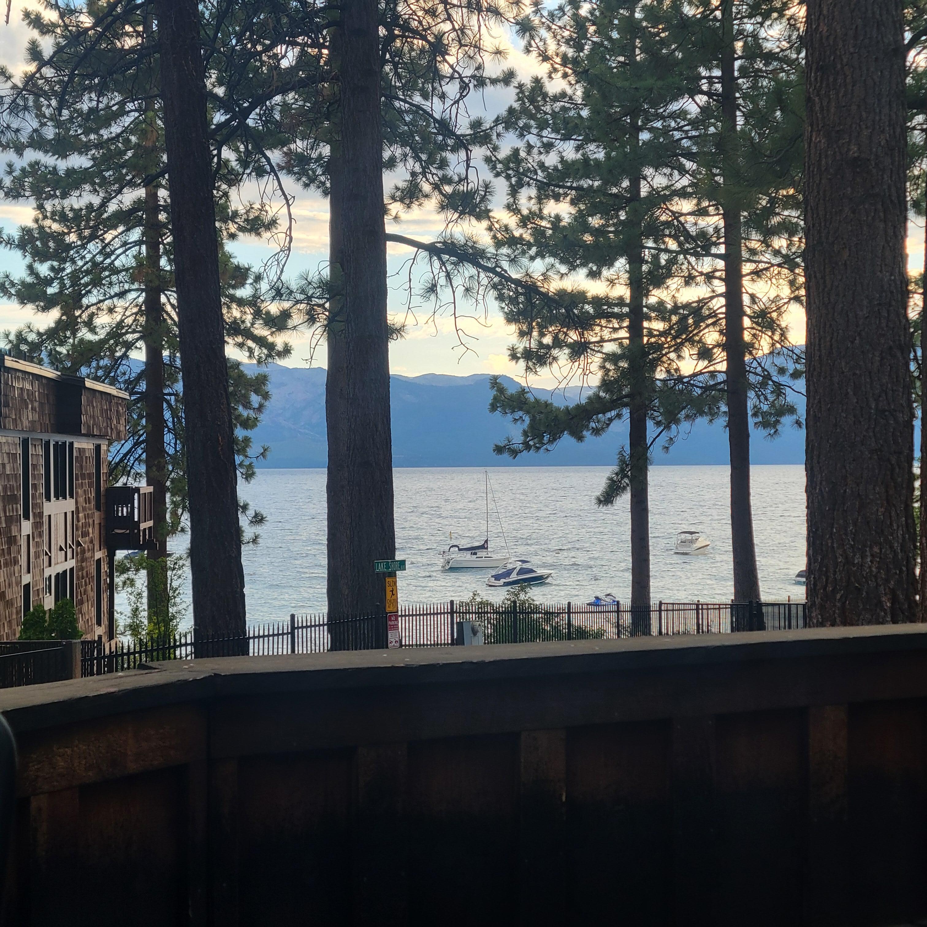 Genießen Sie sich und die Aussicht von einem riesigen offenen Deck. Einige der besten Sonnenuntergänge der Welt. Es gibt viele Parkplätze in dieser sehr exklusiven alten Tahoe-Gemeinde.