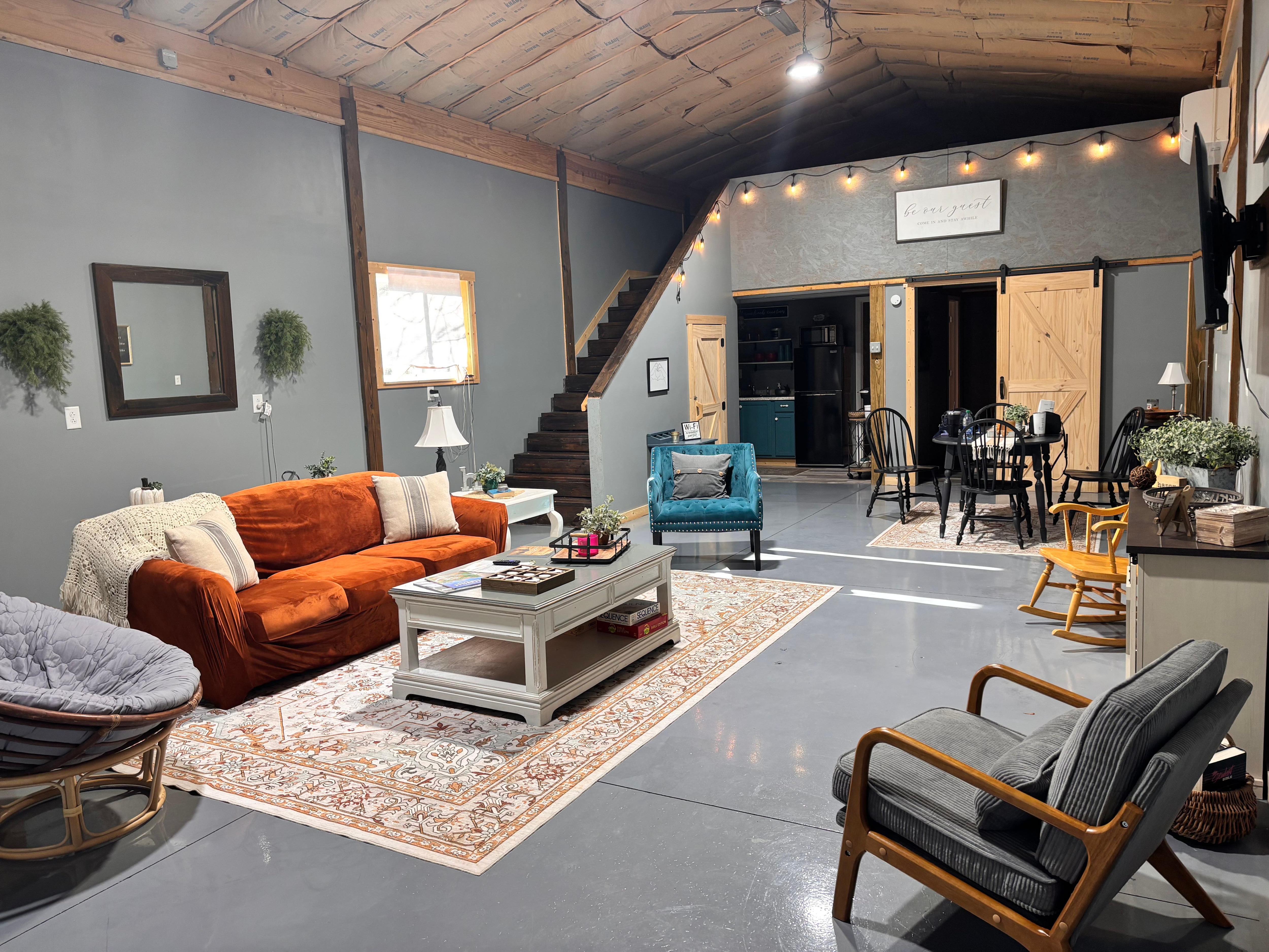 This is a unique, cozy space! It has an open floor plan with a huge living/dining area. The cozy kitchen has a mini coffee bar for you to enjoy in the morning with a stove and microwave. There is a bedroom downstairs with a full bath accessible through the kitchen or bedroom. There is also a loft upstairs with a cozy king bed. You can relax in the chairs out front in the evenings or enjoy some time by the firepit outside - s'mores included! The driveway will accommodate boat trailers!