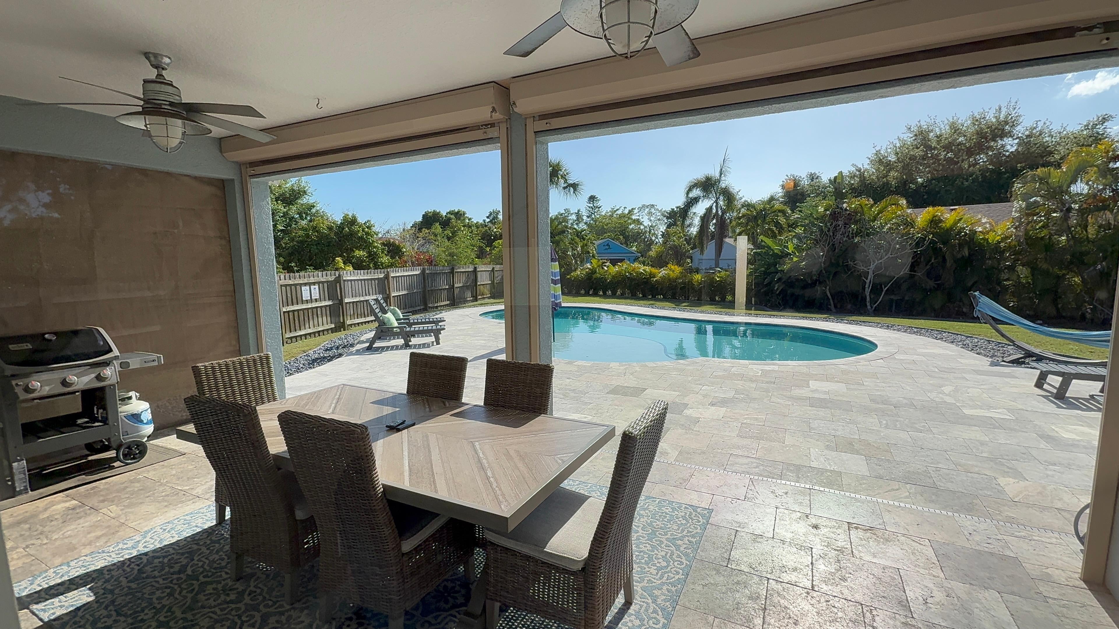 ***POOL AND OUTDOOR SPACE*** SALTWATER pool surrounded by large travertine stone pool deck, HUGE backyard with privacy fence, and covered patio. Saltwater pools avoid chemicals that can leave hair and skin dried out, but with the feel of softened water rather than ocean water. It's the best of both worlds! This large pool and lounge area with patio furnishings are perfect for enjoying time on your Florida vacation in the sun, making memories with family and friends. Pool can be heated for $25/day or $100/week.