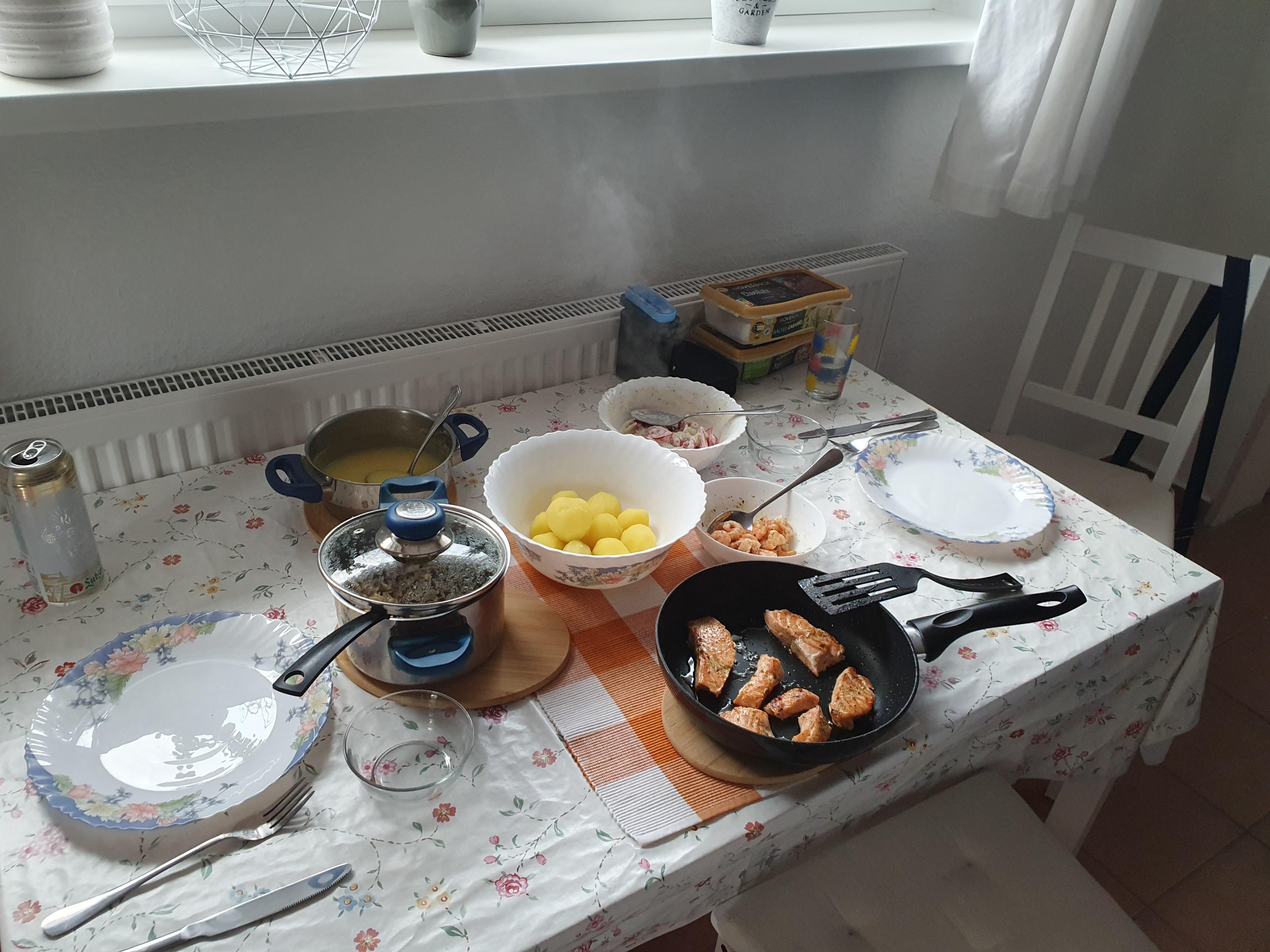 In der komplett eingerichteten KĂŒche befindet sich eine KĂŒchenzeile mit KĂŒhlschrank inklusive Gefrierfach, Herd, Backofen, SpĂŒle, Kaffeemaschine, Mikrowelle, Wasserkocher und Toaster.