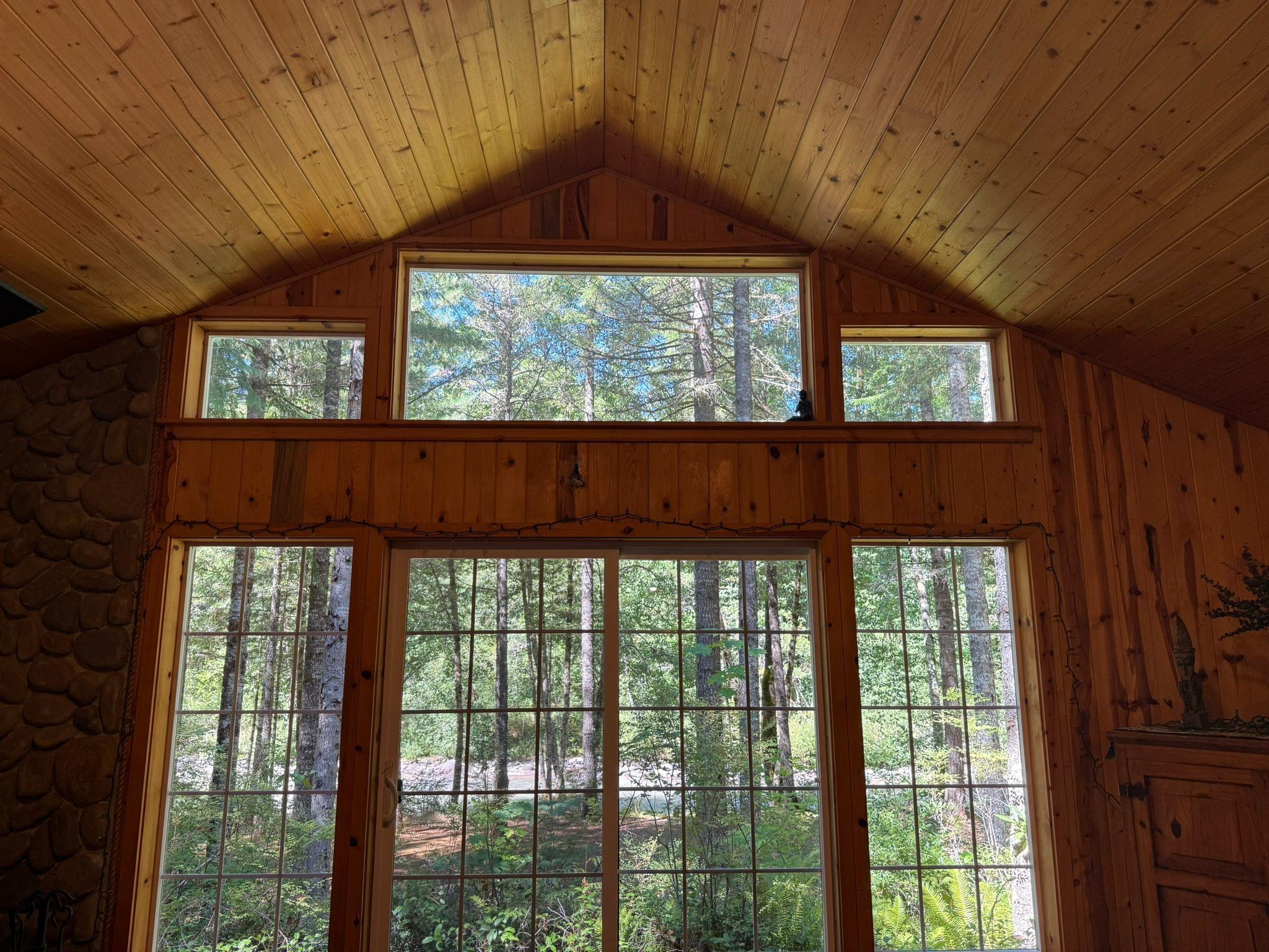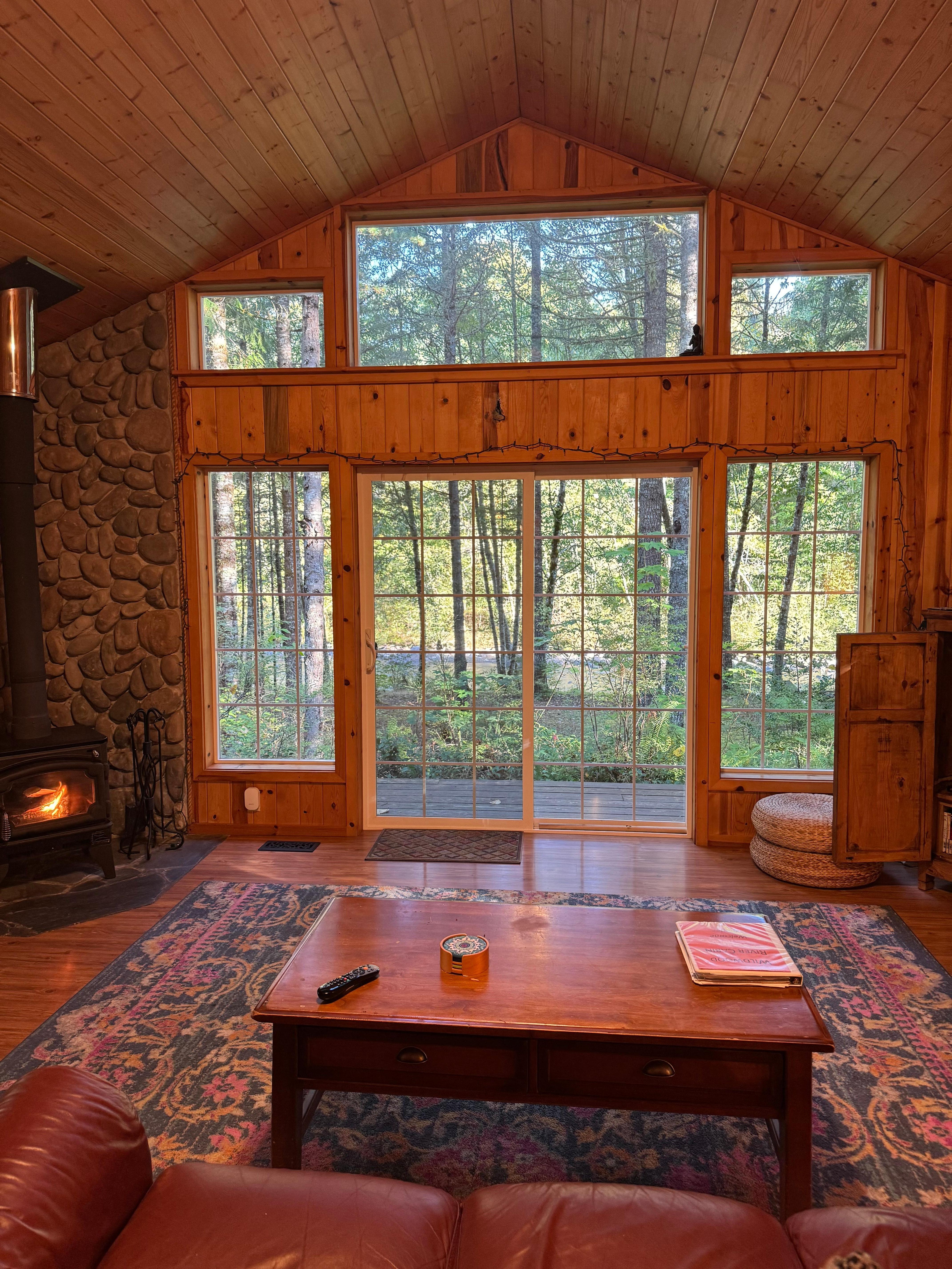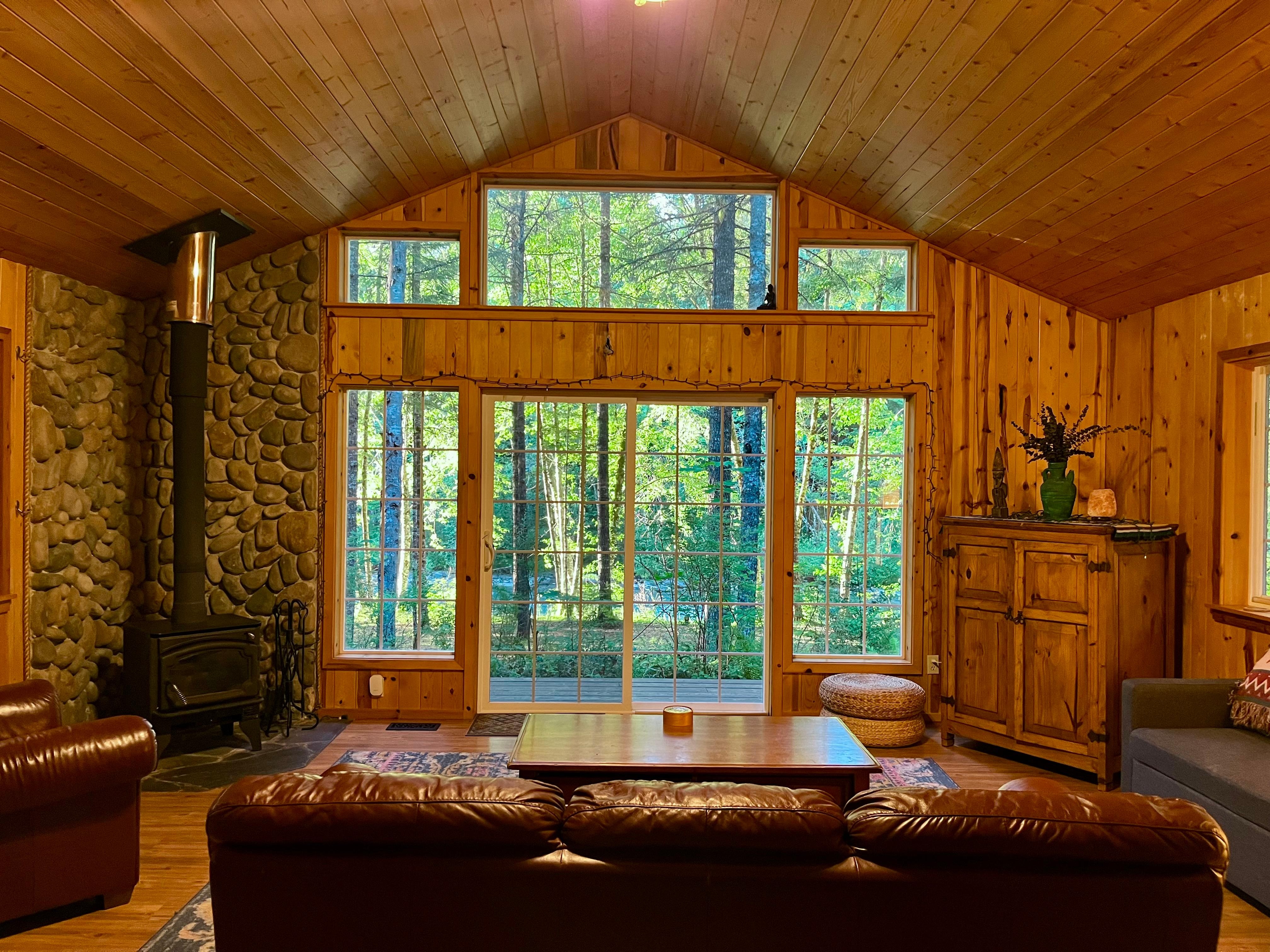 Die knorrigen Kiefern Wänden, gewölbten Decken und individuelle Kiefernholzarbeiten in der Kabine machen es zu einem besonders warmen und gemütlichen Rückzugsort für Sie und Ihre Lieben. Die offene große Zimmer verfügt über ein Klarglas-Holzofen und einer Wand aus Fenstern mit Panoramablick auf den Fluss durch die Wildwoods. Draußen, nehmen Sie ein Bad im Whirlpool unter den Bäumen beim Einsinken in die Sehenswürdigkeiten, Gerüche und Geräusche des Berges.