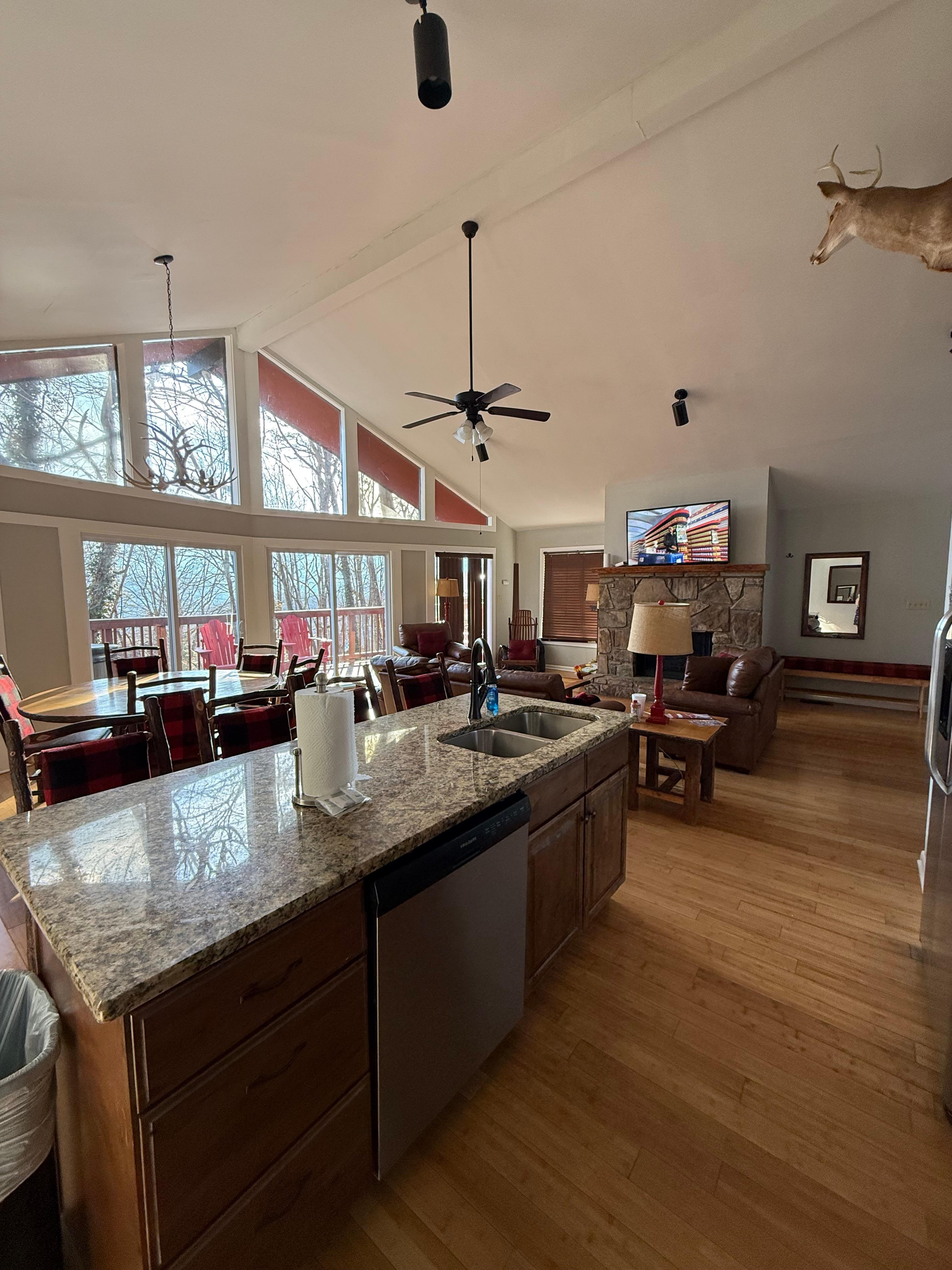 Upstairs living room, dining room, and kitchen with vaulted ceiling and a wall of windows to let in the morning sunrise.