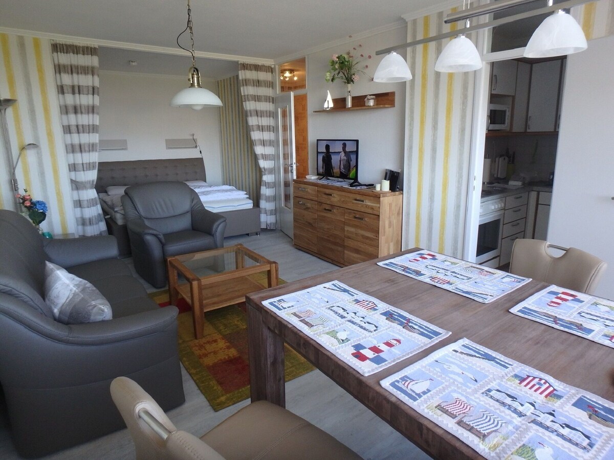 Die Ferienwohnung wurde saniert. Sie erhielt ein neues Duschbad, Küche und wurde mit hochwertigen Möbeln ausgestattet.
