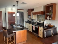 Enjoy a fully equipped kitchen with granite island and countertops.