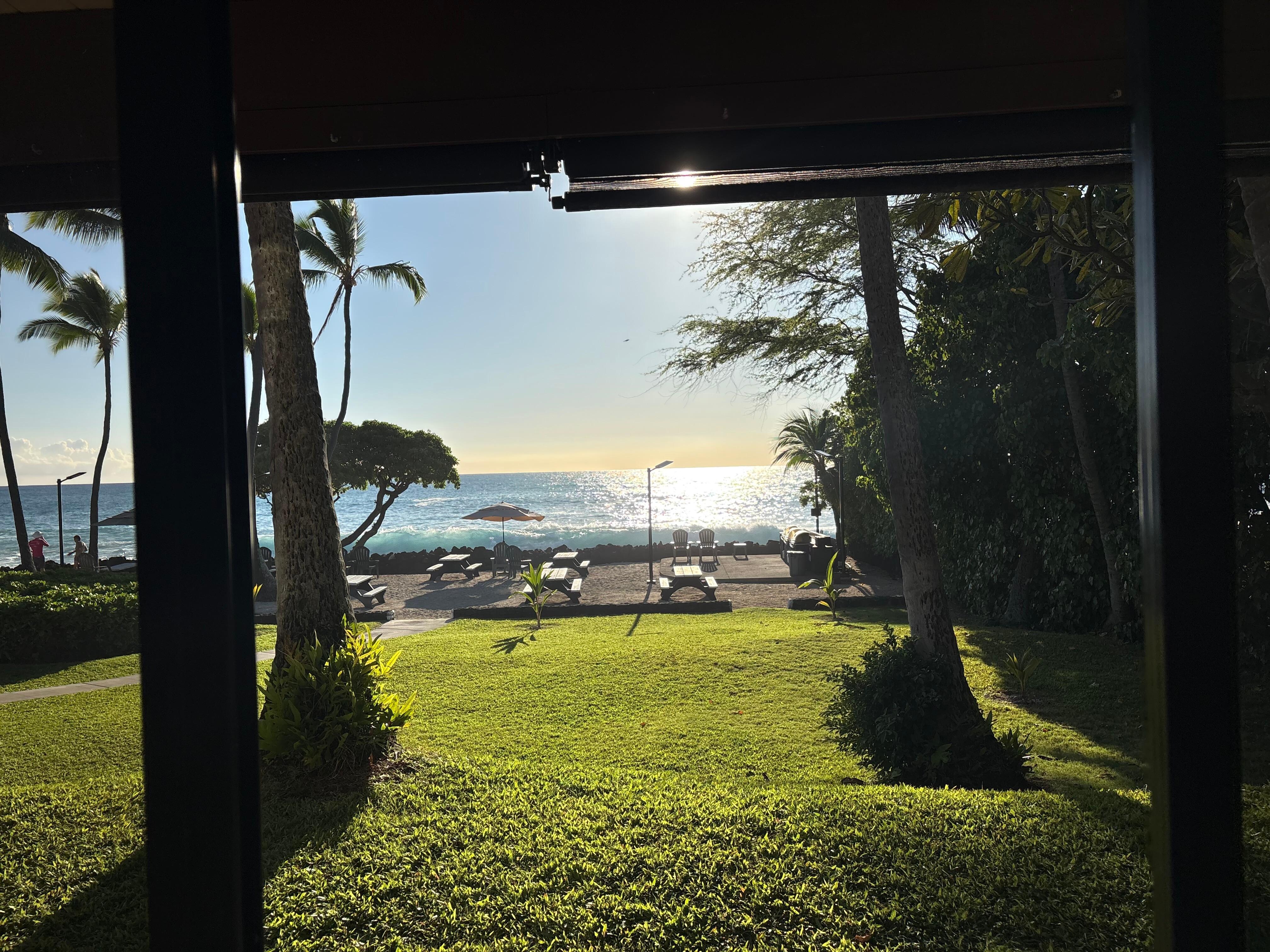 Updated kitchen and bathroom! D2 at the Kona Isle is a beautiful DIRECT OCEANFRONT property on the 1st floor of building D! No stairs! Cook in the full kitchen or on the grill! Enjoy dinner with a sunset view from your living room, lanai, or picnic tables! Feel the ocean breezes come into your living room in this gorgeous 1 bedroom, 1 bath condo and sleep to the sound of waves! The sofa does pull out to a bed, so a great option for 4! The living room has a split AC unit. The AC is ONLY in the living room. This amenity is FREE! The owner supplies beach chairs, towels, high-speed Wi-Fi Access for your convenience. Free HBO-max! This unit is in high demand! Truly a gem! Look no further, you've found the perfect vacation rental property for your next Hawaiian adventure!