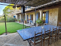 Die in einem Landhausstil errichtete Küche bietet sehr viel Platz zum Kochen, Vorbereiten und zum Sitzen. Sie ist ebenso durch eine Terrassentür mit der Terrasse verbunden. Hier steht im Schatten einer Pergola ein großer Esstisch mit majorquinischen Fliesen. Zudem bietet der ehemaliger Mahlplatz einen in Stein eingebauten Grill und einen großen runden Steintisch. Dieser Ort ist ideal für ein schattiges Frühstück oder Abendessen unter freiem Himmel.