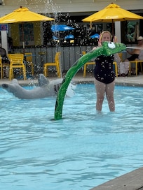 Just outside the exterior door in the living area is a large porch. There are tables and chairs for seating and dining on the porch. There is also a hot tub located on the porch.