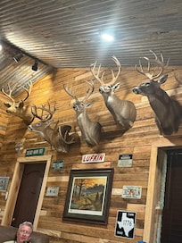 Outside there are several seating and dining areas and plenty of parking space for vehicles, trailers, RVs, and more. The view is serene year-round! The Lodge is located on a hill, so the sunrises and sunsets are spectacular. Wildlife such as birds, squirrels, deer, turkeys, and rabbits can always be spotted on the property. Guests may also explore the property via various walking trails.